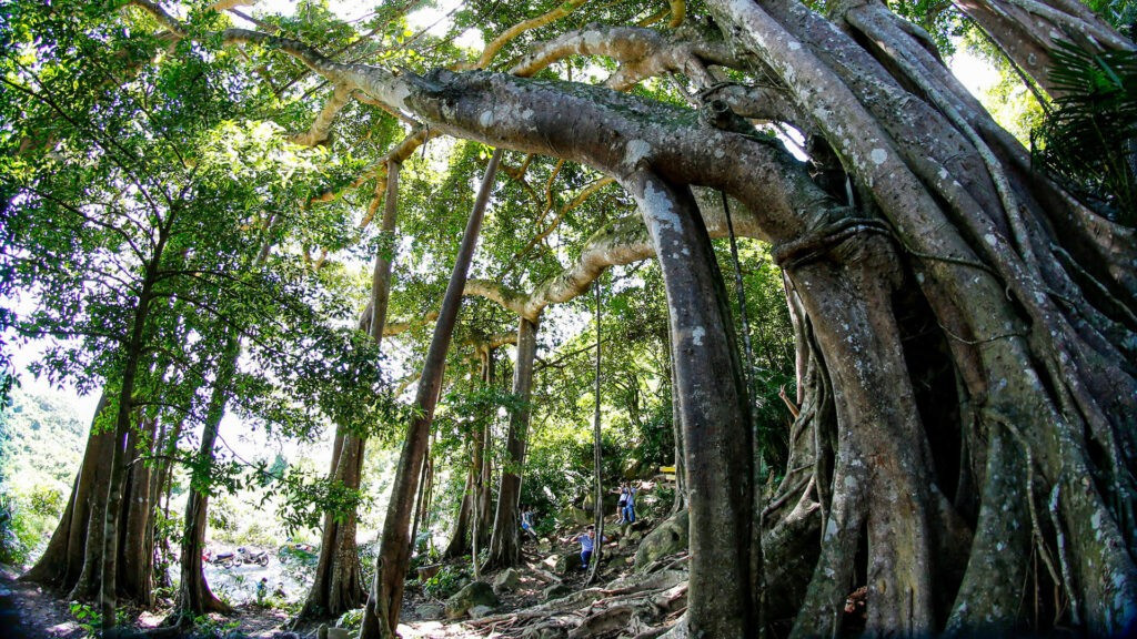 Dưới tán cây cổ thụ, du khách có thể nghỉ chân, hít hà không khí trong lành và ngắm nhìn những cá thể voọc chà vá chân nâu – loài linh trưởng quý hiếm chỉ xuất hiện tại khu bảo tồn Sơn Trà. Ảnh Báo Nhân Dân