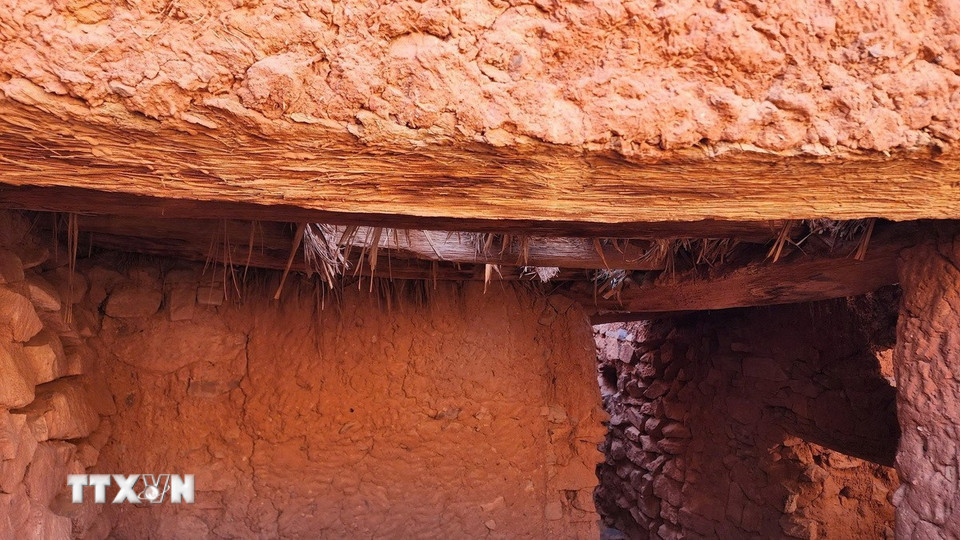 Mái nhà được lợp bằng thân cây chà là và đất sét. (Ảnh: Mạnh Hùng/TTXVN)