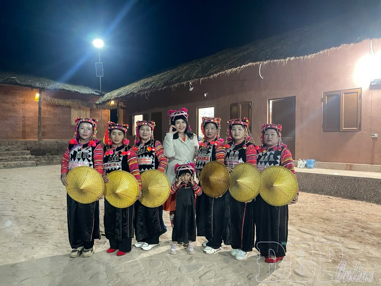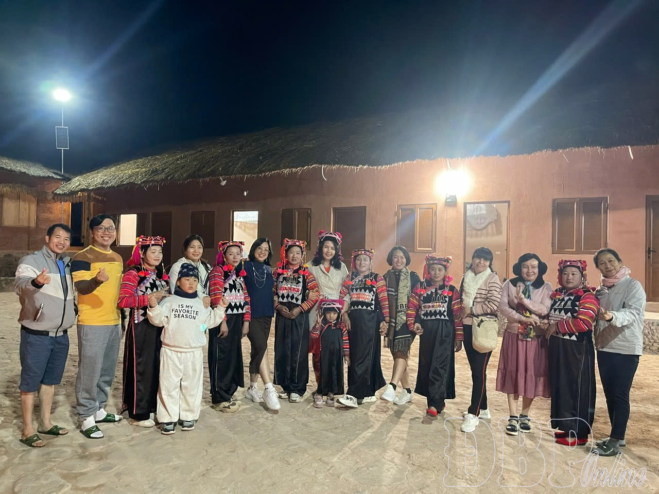 Du khách chụp ảnh lưu niệm cùng đồng bào dân tộc Hà Nhì trước ngôi nhà trình tường.