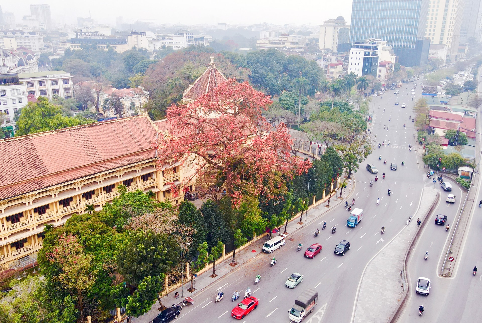 Cách đó không xa, cũng trong lòng thành phố, cây gạo hơn trăm tuổi tại Bảo tàng Lịch sử Quốc gia cũng đang khoe sắc đỏ rực rỡ. Sắc đỏ đặc trưng của hoa hòa cùng kiến trúc Pháp cổ tạo nên một tổng thể hài hòa và thanh bình. Vì thế, nơi đây luôn là điểm thu hút đông người dân và du khách tham quan, chụp ảnh.