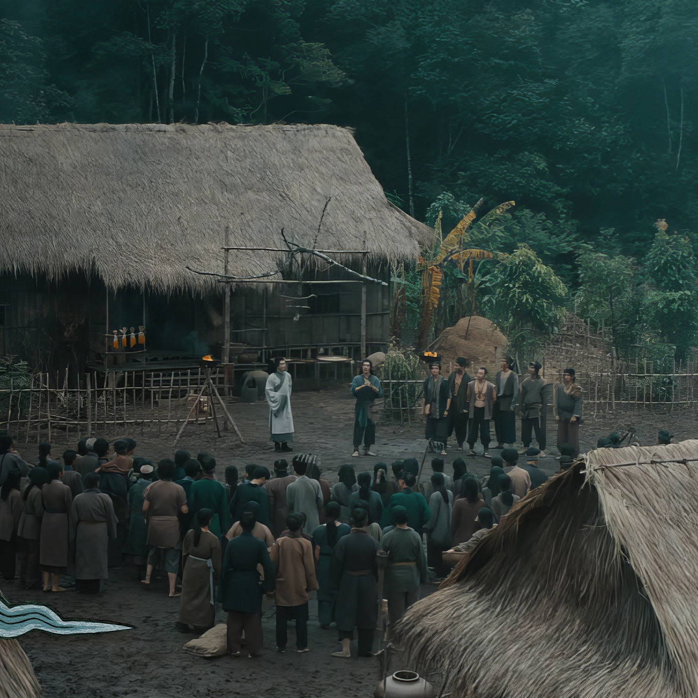 Những ngôi nhà vách tre sàn gỗ lợp tranh đơn sơ được dựng lên tại đây - trong bối cảnh của thời Lê Trung Hưng. Ê-kíp còn sắp xếp nhiều đạo cụ cho thấy cuộc sống sinh động của dân làng như những luống hoa, luống rau, chuồng nuôi gia cầm, các dụng cụ săn bắt, dệt may vải.