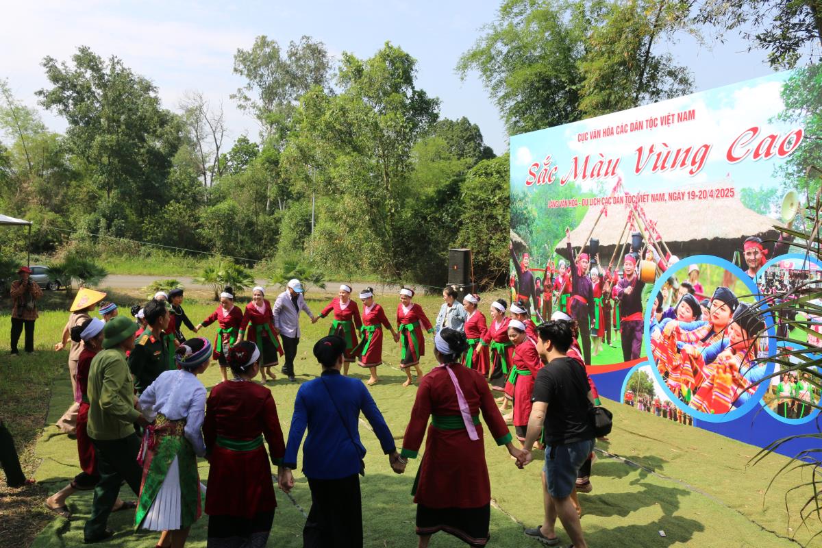 Đồng bào các dân tộc thiểu số và du khách tham gia các tiết mục văn nghệ tại Làng Văn hóa - Du lịch các dân tộc Việt Nam. Ảnh: Bích Nguyên