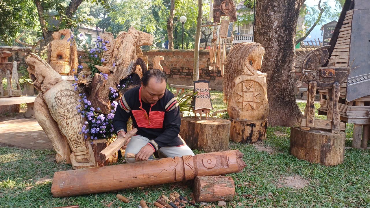 Nghệ nhân Y Bhiông Buôn Yă, dân tộc Ê Đê, Đăk Lăk ngồi tạc tượng ngựa