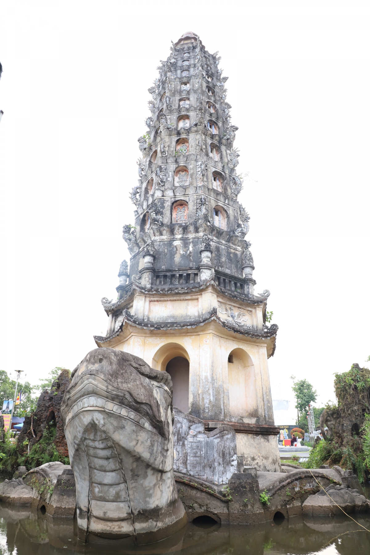 Phía trước chùa là tháp Cửu Phẩm Liên Hoa cao khoảng 32m, có 8 mặt, được xây dựng vào năm 1927. Tháp đặt trên lưng một con rùa khổng lồ, đầu rùa hướng về phía chùa, giữa một hồ vuông tĩnh lặng. Bốn góc hồ là bốn núi giả, mỗi núi có một tượng voi lớn đứng chầu. Bên trong tháp là cầu thang xoắn ốc gồm 98 bậc, dẫn du khách lên tận đỉnh, nơi có thể nhìn bao quát toàn cảnh chùa và vùng đất Cổ Lễ thanh bình.