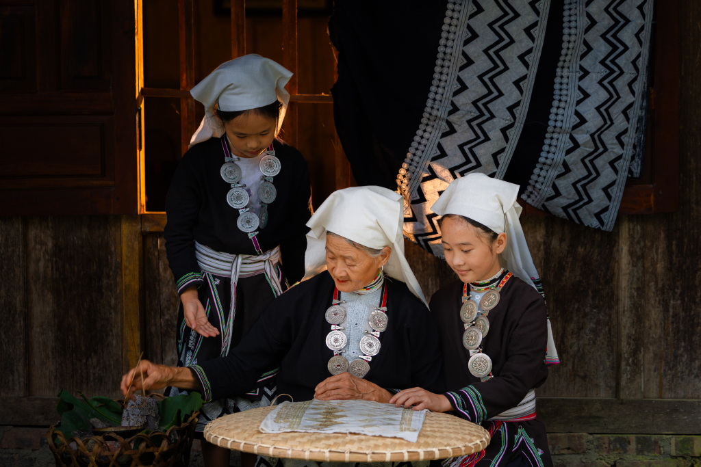 Không cần thước kẻ hay bản phác thảo, phụ nữ Dao Tiền vẽ hoa văn hoàn toàn bằng trí nhớ và cảm quan. Sáp ong nóng chảy khi vẽ lên vải sẽ ngăn màu chàm ngấm vào, tạo nên những hoa văn trắng xanh độc đáo. Một kỹ thuật "in ấn" thủ công đầy trí tuệ của người xưa.