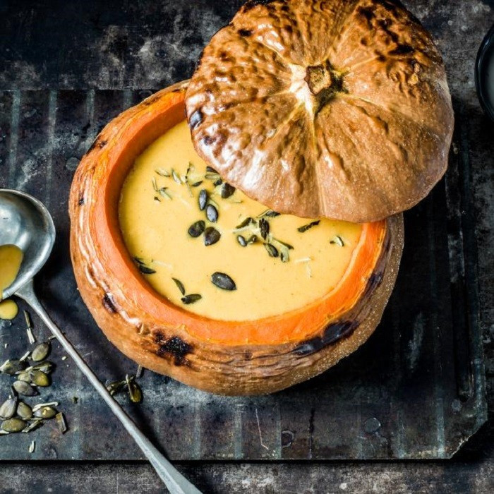 Biểu tượng quen thuộc nhất của Halloween – bí đỏ – cũng góp mặt trong nhiều món ăn. Trong đó, súp bí đỏ được xem là món “kinh điển” trên bàn tiệc. Ở mỗi quốc gia, công thức chế biến lại khác nhau: có nơi nấu cùng thịt bò, thịt cừu để tăng vị béo; có nơi lại chọn chế biến chay, kết hợp với kem tươi hoặc bơ tạo nên món súp sánh mịn, đậm đà hương vị mùa thu. Ảnh luhanhvietnam