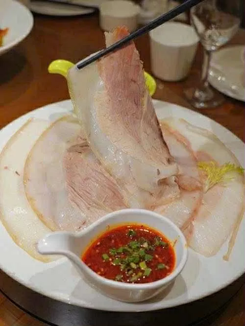 Món thịt trắng Lý Trang được xắt mỏng như tờ giấy, để thực khách tự cuộn lại ăn kèm nước chấm đặc biệt.