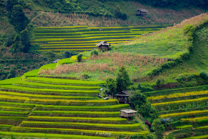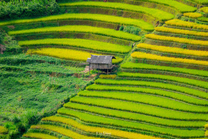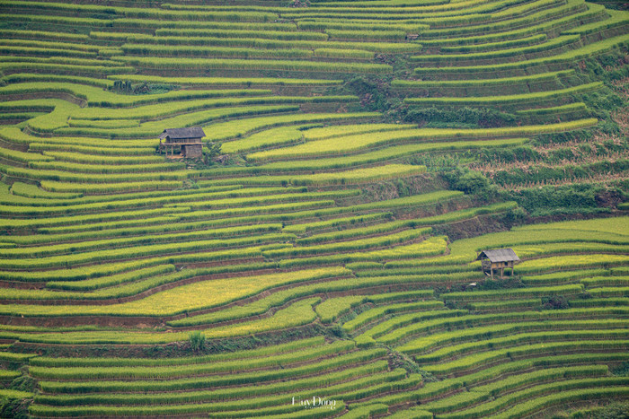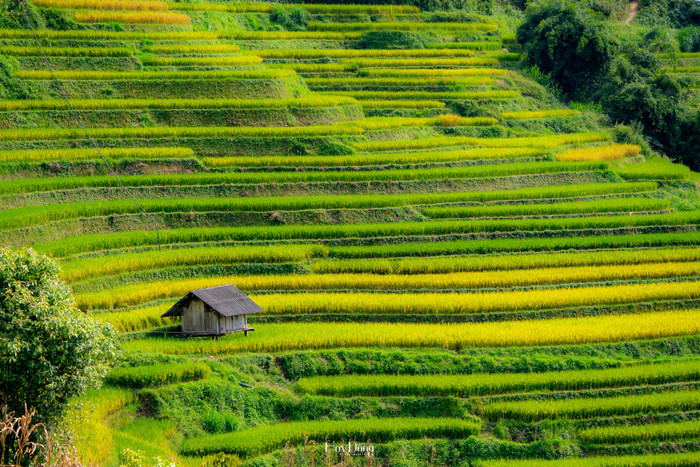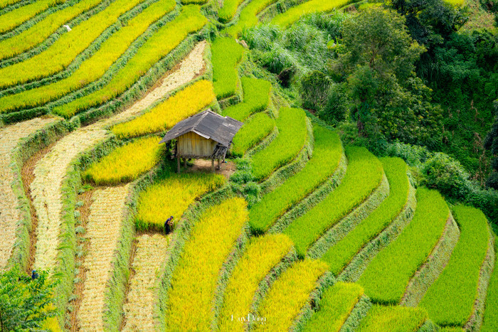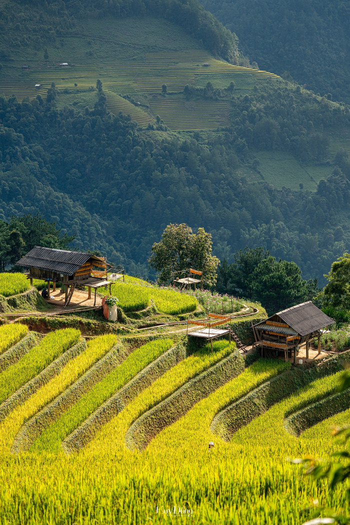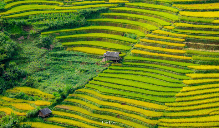 Góc chụp từ trên cao, những ngôi nhà gỗ như những chiếc hộp nhỏ xíu giữa tấm thảm vàng khổng lồ của ruộng bậc thang. Ảnh: Đổng Nhật Huy