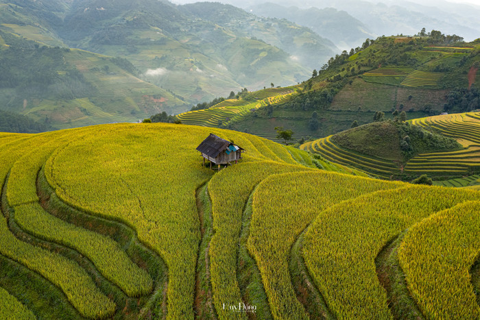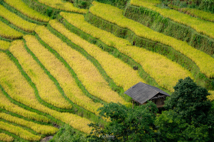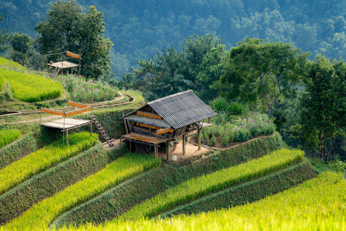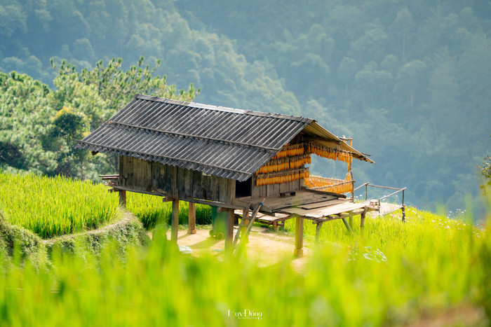Góc ảnh nghệ thuật ghi lại một "penthouse" lọt thỏm giữa biển lúa vàng, minh chứng cho vẻ đẹp mộc mạc và đầy quyến rũ của Mù Cang Chải. Ảnh: Đổng Nhật Huy