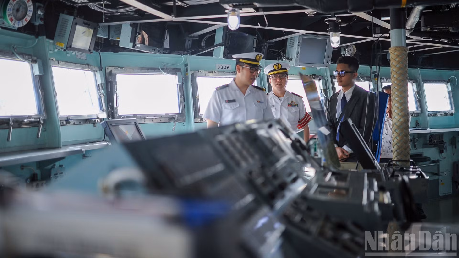 Trong khuôn khổ buổi giao lưu, sĩ quan lực lượng tự vệ trên biển Nhật Bản giới thiệu và trình diễn các nghi thức truyền thống thông qua hệ thống kèn hiệu đặc trưng của tàu.