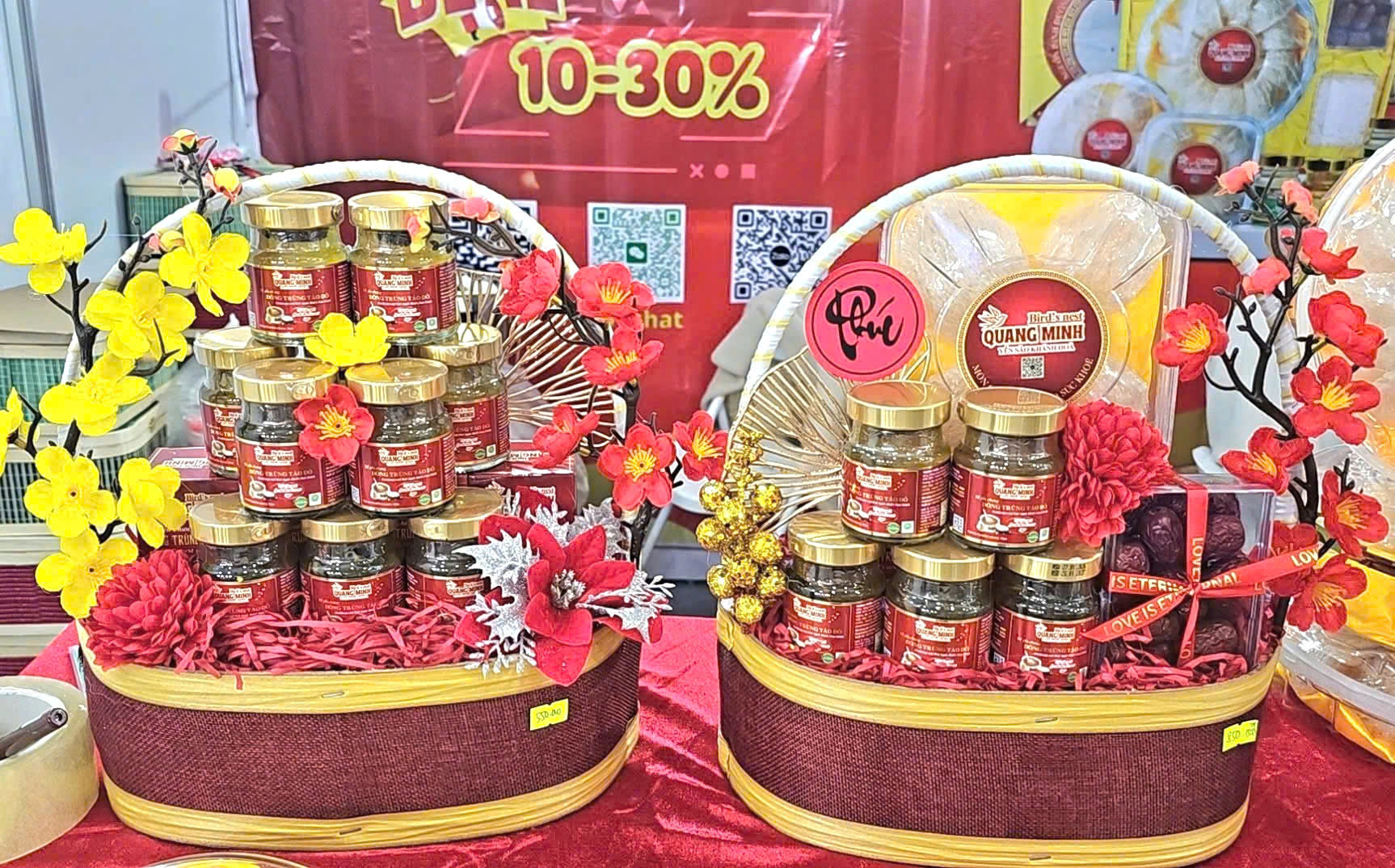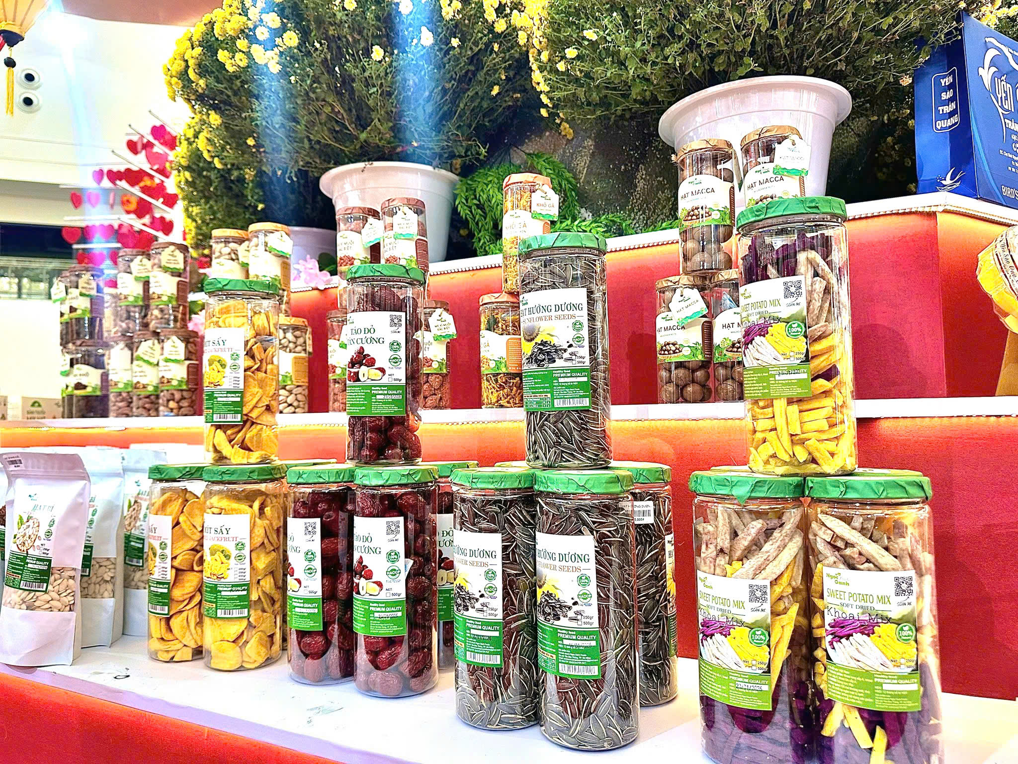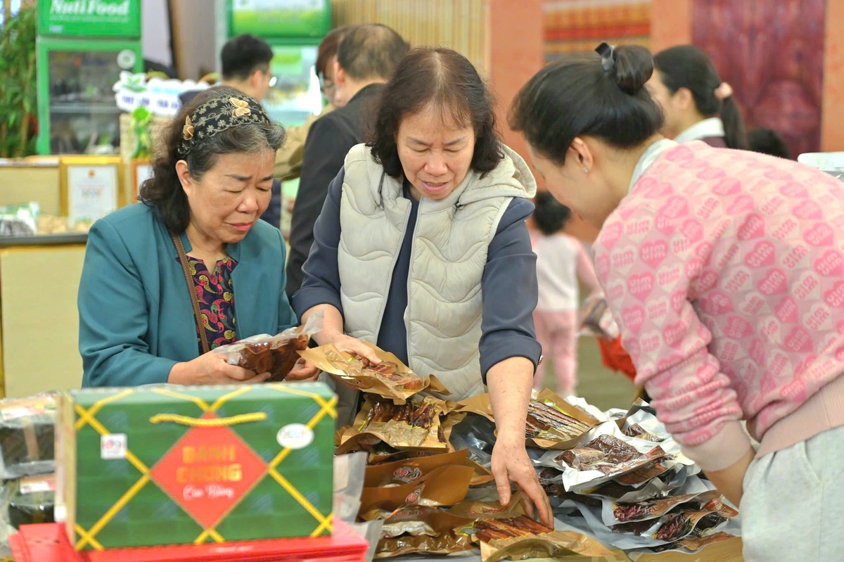 Các sản phẩm phục vụ Tết truyền thống như bánh chưng, giò chả, mứt Tết, các loại hạt, trà, cà phê tiếp tục chiếm tỷ trọng lớn tại hội chợ. Nhiều gian hàng bố trí sẵn các combo quà Tết với mức giá đa dạng, thuận tiện để lựa chọn làm quà biếu.