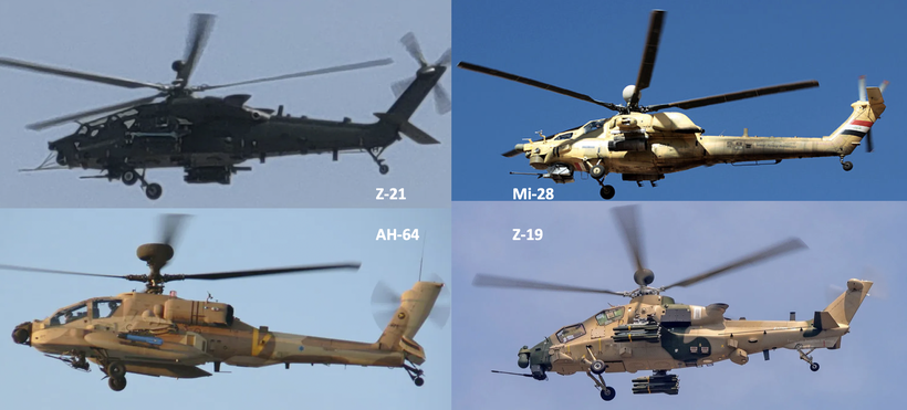 So sánh hình dạng 4 mẫu trực thăng tấn công Z19, Z-21 (Trung Quốc), MI-28 (Nga) và AH-64 (Mỹ). Ảnh: Zhihu.