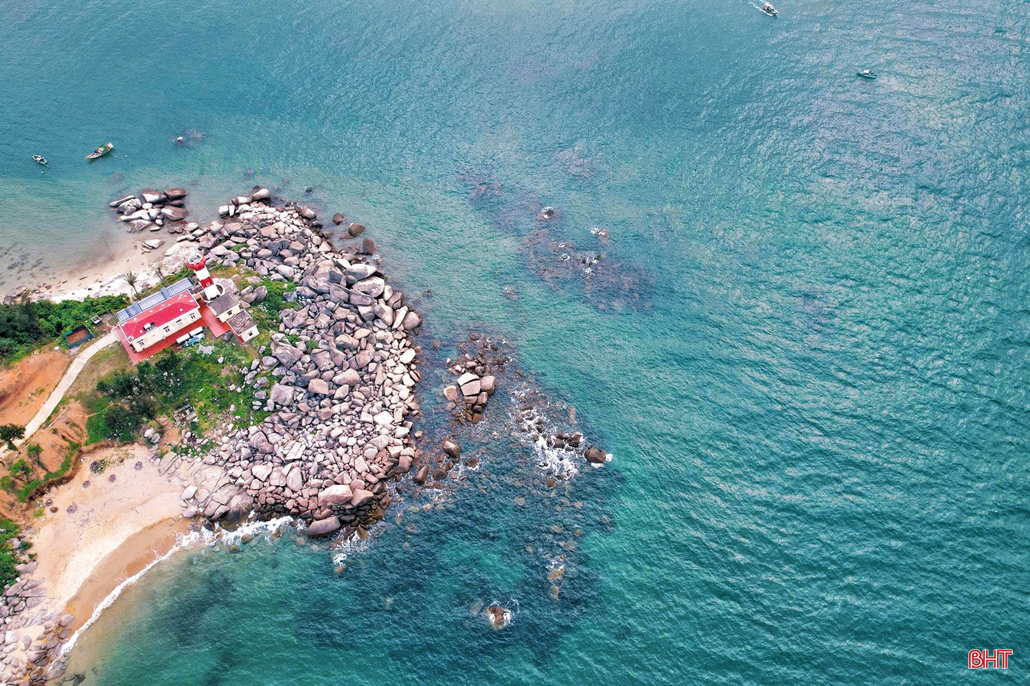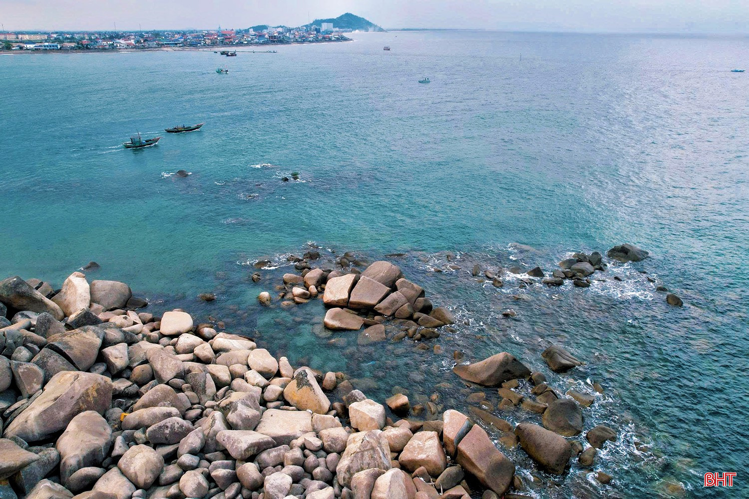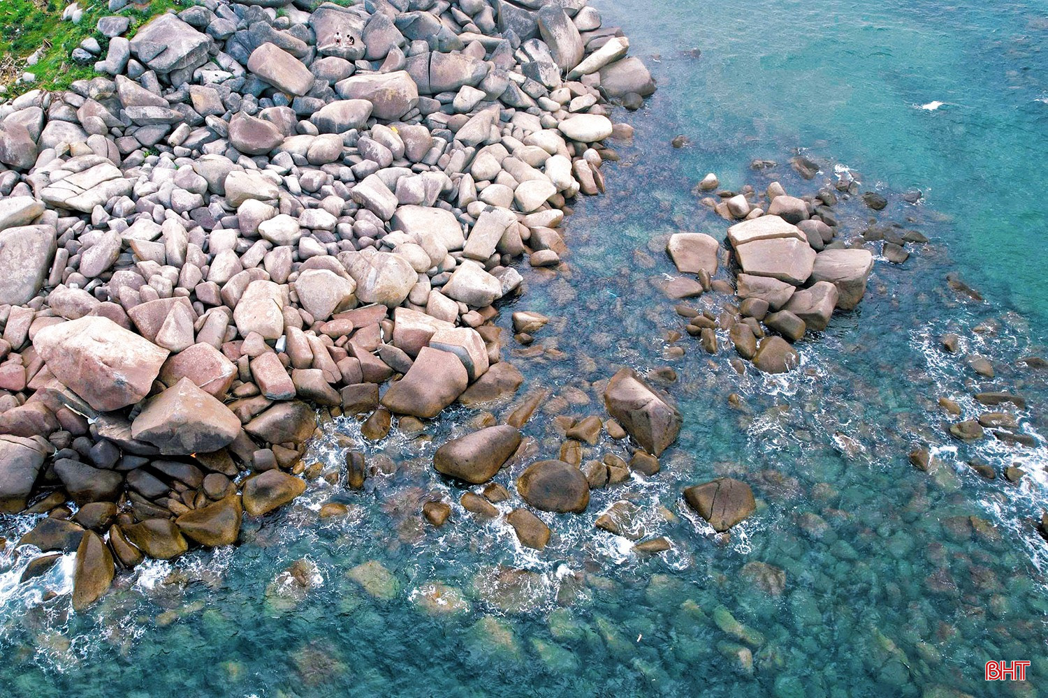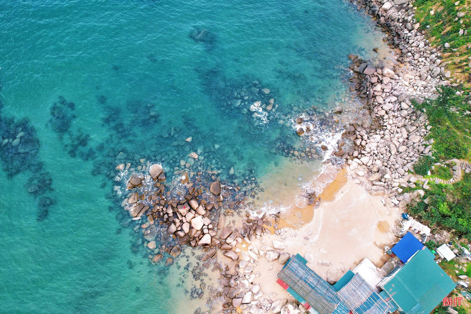 Từ góc nhìn trên cao, nước biển Hải Đăng trong vắt, những mảng đá ngầm hiện lên với hình thù độc đáo, tạo nên bức tranh thiên nhiên sống động và cuốn hút.