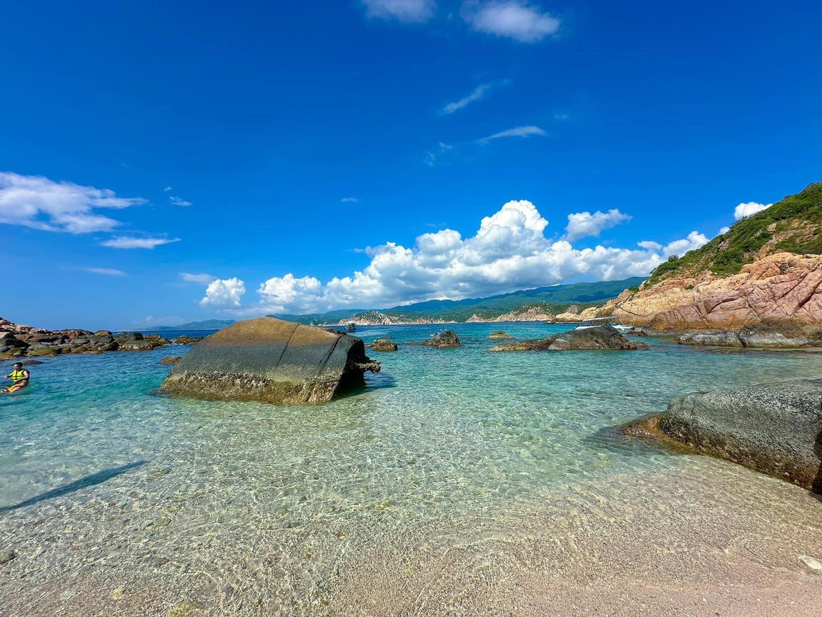 Bãi Thùng là gợi ý đầu tiên của người dân bản địa. Con đường nhỏ men theo núi đưa bạn đến bãi cát trắng mịn, sóng êm và nước trong đến mức có thể nhìn thấy tận đáy. Vào buổi sớm, mặt biển ánh lên sắc ngọc bích, phản chiếu ánh nắng vàng rực rỡ. Đây là nơi lý tưởng để tắm biển, câu cá hoặc lặn ngắm san hô, nơi sao biển và nhum to bằng bàn tay nằm ẩn mình dưới làn nước trong xanh. Ảnh Viên La Cà