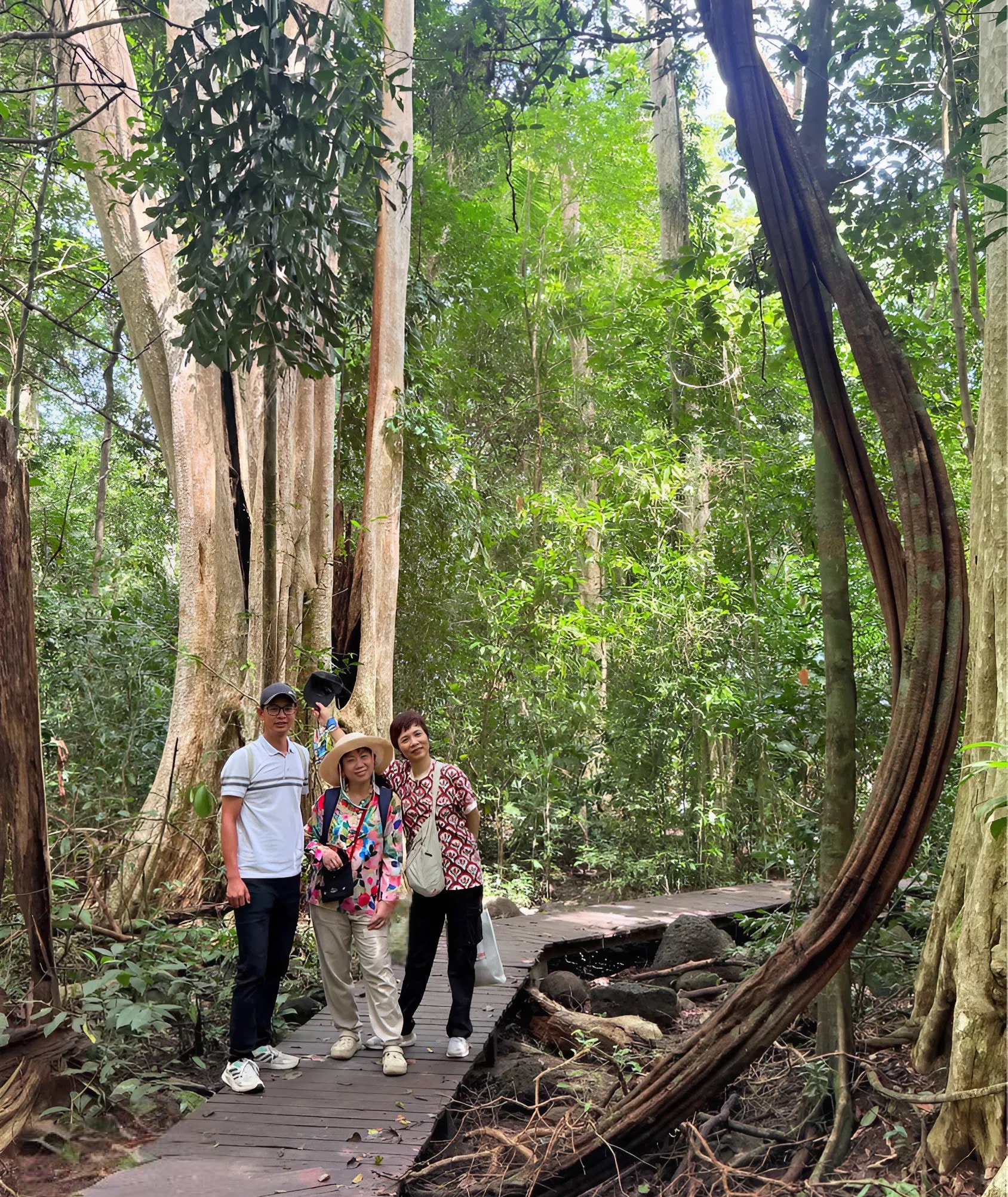 5 km xuyên rừng tiếp theo là cung đường khám phá thiên nhiên, từ thảm thực vật dưới chân, tầng cây ngang người đến những cây đại thụ khổng lồ cao chót vót. Xen lẫn với tiếng lao xao của cây rừng là những tiếng chim lảnh lót, rộn ràng, vui tươi; may mắn hơn có thể thấy bóng dáng những chú khỉ chuyền cành. Đây cũng là cung đường mòn xuyên rừng không sóng wifi và không được phép sử dụng phương tiện cơ giới… để mỗi du khách đều được đắm mình với thiên nhiên hoang sơ, kỳ thú giữa đại ngàn.