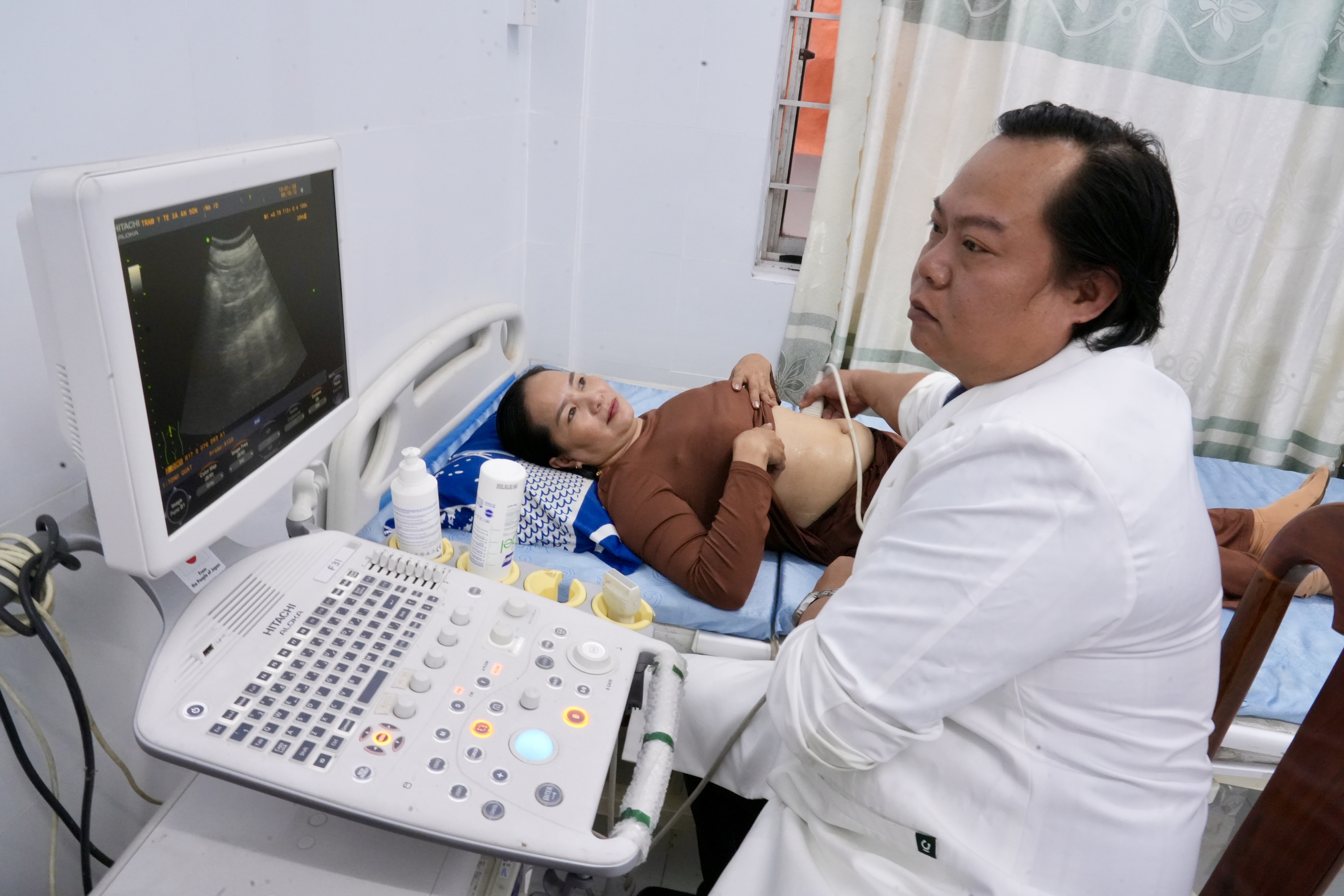 Bác sĩ Nguyễn Văn Lin, trưởng điểm trạm y tế An Sơn, đang siêu âm cho người bệnh. Ảnh: TT