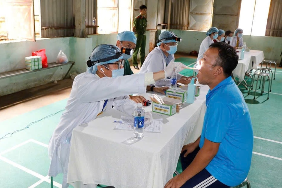 Các bác sĩ và nhân viên y tế lấy thông tin, tư vấn chăm sóc, khám sức khỏe cho từng học viên