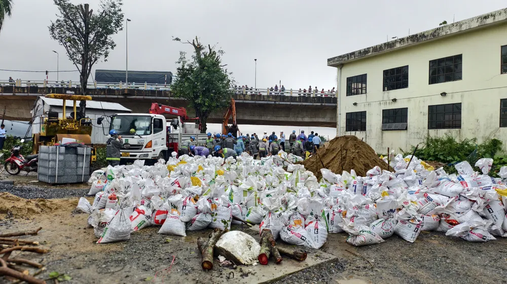 Đến 16 giờ ngày 29-10, lực lượng chức năng tỉnh Quảng Ngãi vẫn đang khẩn trương dùng cát bịt miệng cống tại trạm bơm trong dự án Kè chống sạt lở và cải tạo cảnh quan bờ nam sông Trà Khúc để ngăn nước sông Trà Khúc chảy ngược vào trong.