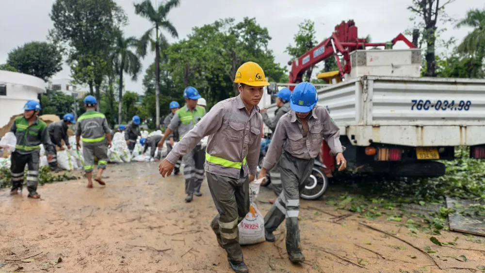 Công nhân môi trường đô thị chuyển cát vào bịt miệng cống.