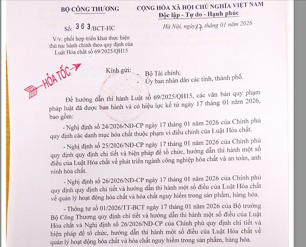 Bộ Công Thương vừa có văn bản hỏa tốc gửi Bộ Tài chính, UBND các tỉnh, thành phố về việc phối hợp triển khai thực hiện thủ tục hành chính theo quy định của Luật Hóa chất (sửa đổi).