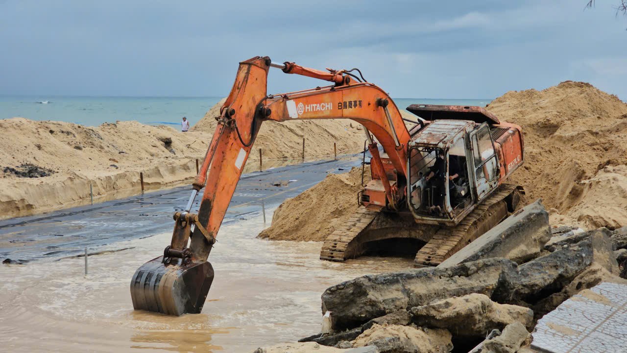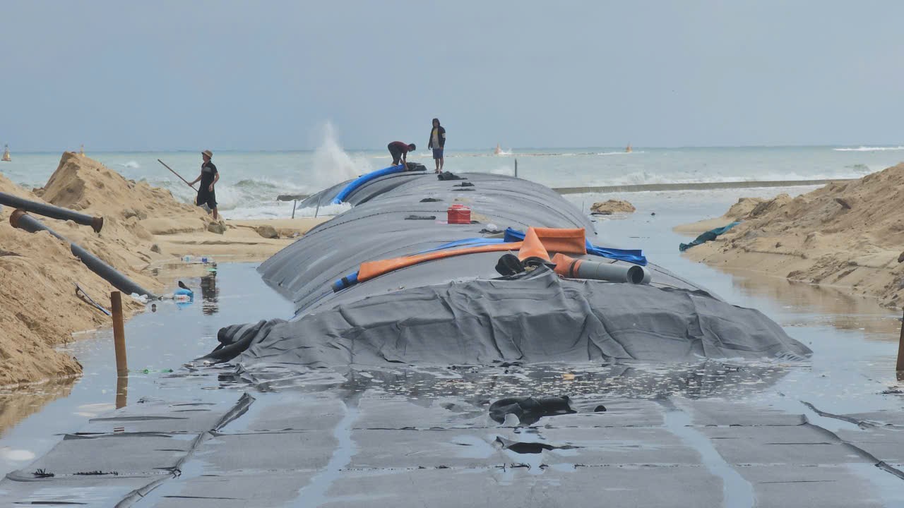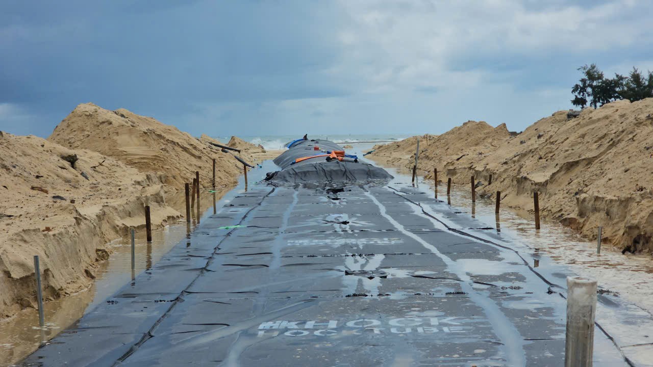 Lực lượng thi công dùng máy múc, đào rãnh sâu dọc đoạn bãi biển sạt lở, sau đó dùng ống vải địa kỹ thuật (chuyên dùng để phòng, chống sạt lở bờ biển), bơm cát vào bên trong tạo thành một tuyến đê mềm chắn sóng có chiều dài hơn 400m, cao 2m, bảo vệ tạm thời khu vực chịu ảnh hưởng mạnh bởi thiên tai.