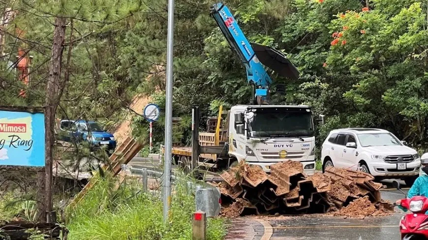 Cơ quan chức năng tỉnh Lâm Đồng huy động máy móc, xử lý điểm sạt lở trên đèo Mimosa xuyên đêm.