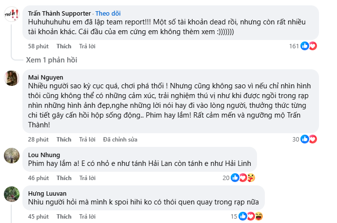 Dưới bài đăng của Trấn Thành, phản ứng của công chúng tạo nên một bức tranh đa chiều. Phần lớn khán giả bày tỏ sự đồng cảm. Nhiều người cho biết họ chủ động "lướt qua" các video spoil để giữ cảm xúc trọn vẹn khi ra rạp. Có người còn lập nhóm report các tài khoản đăng tải nội dung phim trái phép. "Đã đặt vé rồi, quyết không xem trước", một khán giả viết. Không ít bình luận nhấn mạnh việc đi xem phim là trải nghiệm tập thể và cần được tôn trọng.