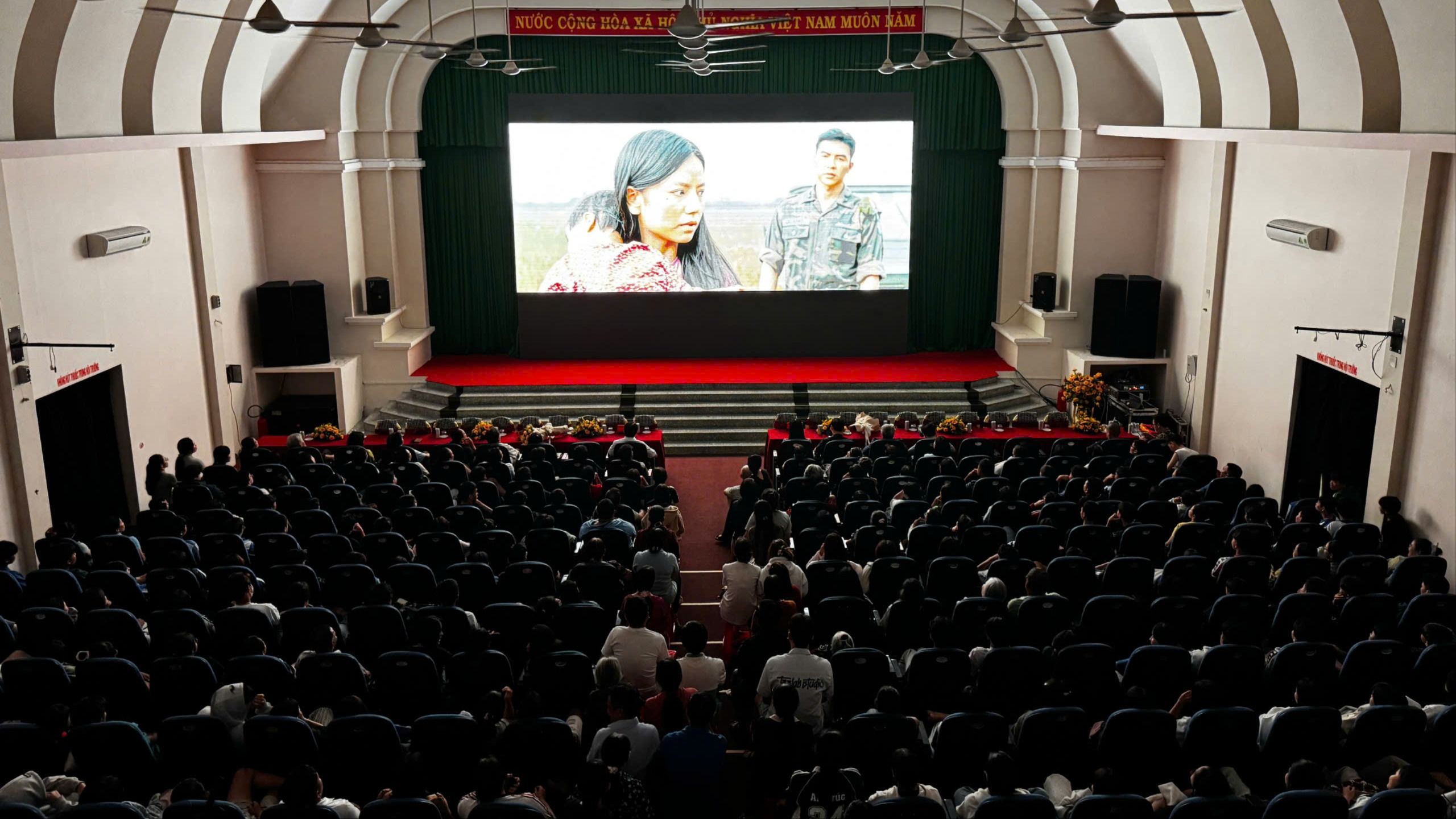 Ngay từ khi bước vào rạp, nhiều người đã nghẹn lòng khi nhìn thấy hàng ghế đặc biệt được bố trí phía trước khu vực khán giả – nơi chỉ đặt khăn rằn và mũ tai bèo, để tưởng niệm các Anh hùng liệt sĩ. Sự trang nghiêm, thiêng liêng ấy khiến không ít người rưng rưng trước cả khi bộ phim bắt đầu.