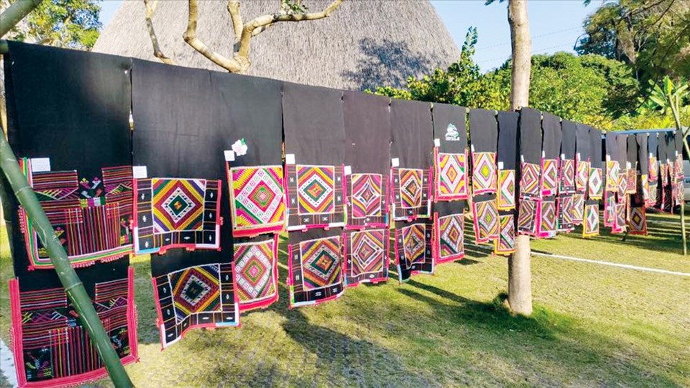 Màu sắc cũng mang nét riêng: xanh của núi rừng, vàng của nương lúa, đỏ – trắng của hoa cỏ, tất cả hòa quyện thành bức tranh thiên nhiên thu nhỏ trên nền vải.