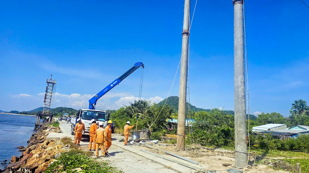 Điện lực An Giang đang phối hợp với lực lượng chức năng chuẩn bị dựng trụ, xây dựng đường dây tạm trên không để cấp điện cho Phú Quốc. Ảnh: EVNSPC