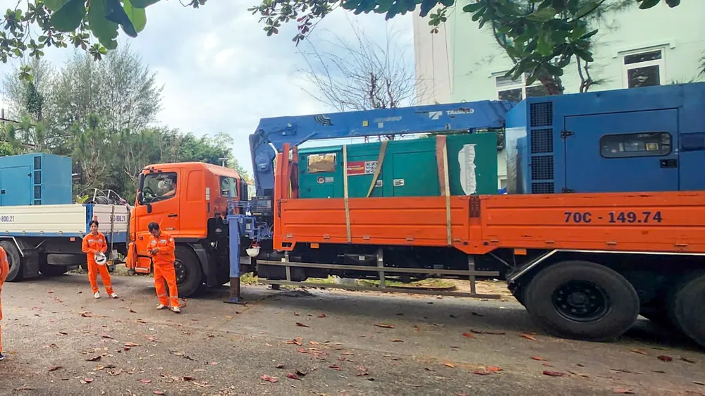 Tổng công ty Điện lực miền Nam đã huy động toàn bộ máy phát di động của các Công ty Điện lực thành viên vận chuyển đến Phú Quốc để tăng nguồn cung cấp điện. Ảnh: EVNSPC