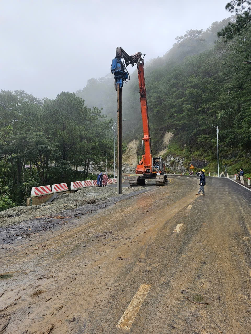 Đơn vị thi công đóng cọc cừ để gia cố đoạn sạt lở trên đèo Prenn.