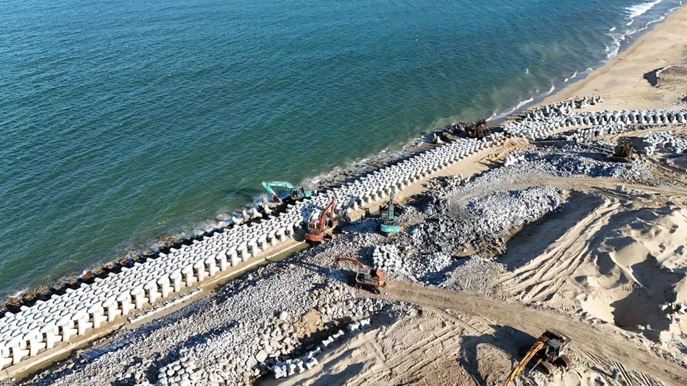 Đoạn bờ kè đang xây dựng nối tiếp đoạn kè Phổ Trường đã hoàn thành cách đây hai năm, tăng chiều dài bờ kè chống sạt lở bờ biển lên gần 1km.