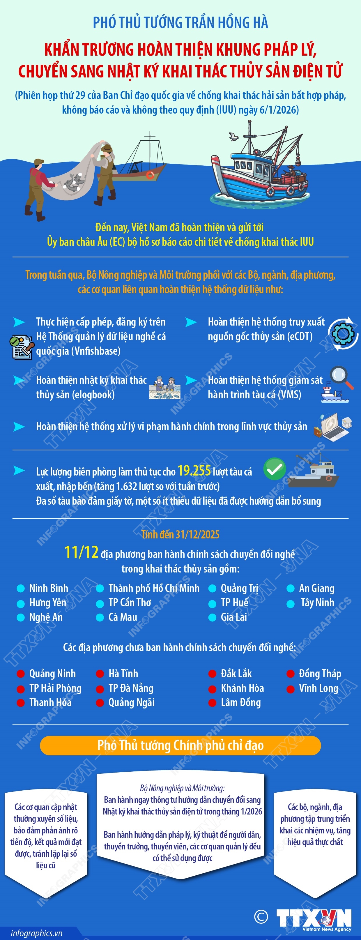 Kết luận phiên họp, Phó Thủ tướng Chính phủ Trần Hồng Hà ghi nhận sự vào cuộc quyết liệt của Bộ Nông nghiệp và Môi trường, các bộ, ngành liên quan và các tỉnh, thành phố ven biển thời gian qua. Đến nay, Việt Nam đã hoàn thiện và gửi tới Ủy ban châu Âu (EC) bộ hồ sơ báo cáo chi tiết về chống khai thác IUU. Phó Thủ tướng yêu cầu các cơ quan cần tiếp tục rà soát, cập nhật thường xuyên số liệu, bảo đảm phản ánh rõ tiến độ và kết quả mới đạt được, tránh lặp lại số liệu cũ; Bộ Nông nghiệp và Môi trường ban hành ngay thông tư hướng dẫn chuyển đổi sang Nhật ký khai thác thủy sản điện tử trong tháng 1/2026 và ban hành hướng dẫn pháp lý, kỹ thuật để người dân, thuyền trưởng, thuyền viên, các cơ quan quản lý đều có thể sử dụng được. Các bộ, ngành và địa phương tập trung triển khai các nhiệm vụ, tăng hiệu quả thực chất để báo cáo Thủ tướng Chính phủ trong tuần tới.