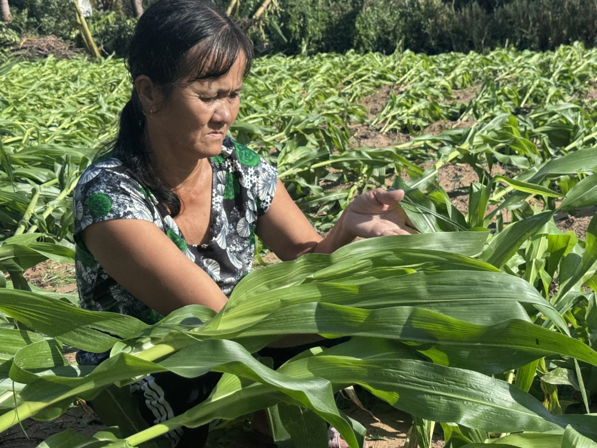 “Bão về nhanh, gió lật đùng đùng mái tôn nhà, phần che sân lật tung bay đi hết. Cả nhà 6 người phải tránh trong nhà vệ sinh, vì có phần mái bê tông che chắn chắc. Trên rẫy mía với ngô cũng bị thổi đổ rạp rồi, giờ không biết tính sao. Bữa nay 67 tuổi rồi mà chưa thấy cơn bão nào mạnh như thế. Giờ khó khăn thế này Nhà nước hay ai hỗ trợ gì là tốt nấy”, bà Sen nói.