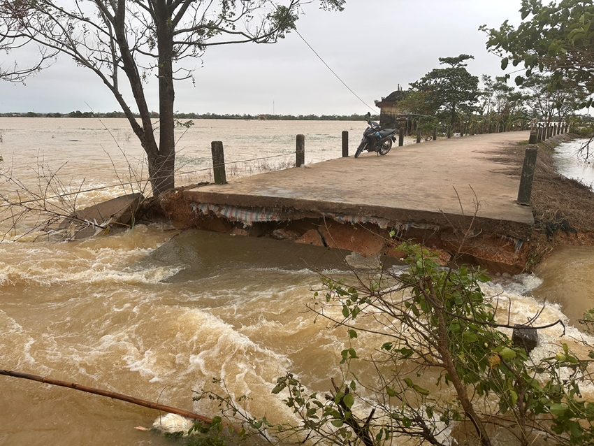 Những ngày qua, mưa lớn kéo dài khiến nhiều khu vực thấp trũng ở Quảng Điền bị ngập sâu. Hàng loạt tuyến giao thông nông thôn, trường học và công trình dân sinh hư hỏng, xuống cấp. Đặc biệt, đoạn đê từ thôn Niêm Phò (xã Quảng Điền) đến thôn Nho Lâm (xã Đan Điền) bị nước chảy xiết làm sạt trôi, phá vỡ mặt đê rộng khoảng 7m, chia cắt giao thông hoàn toàn.