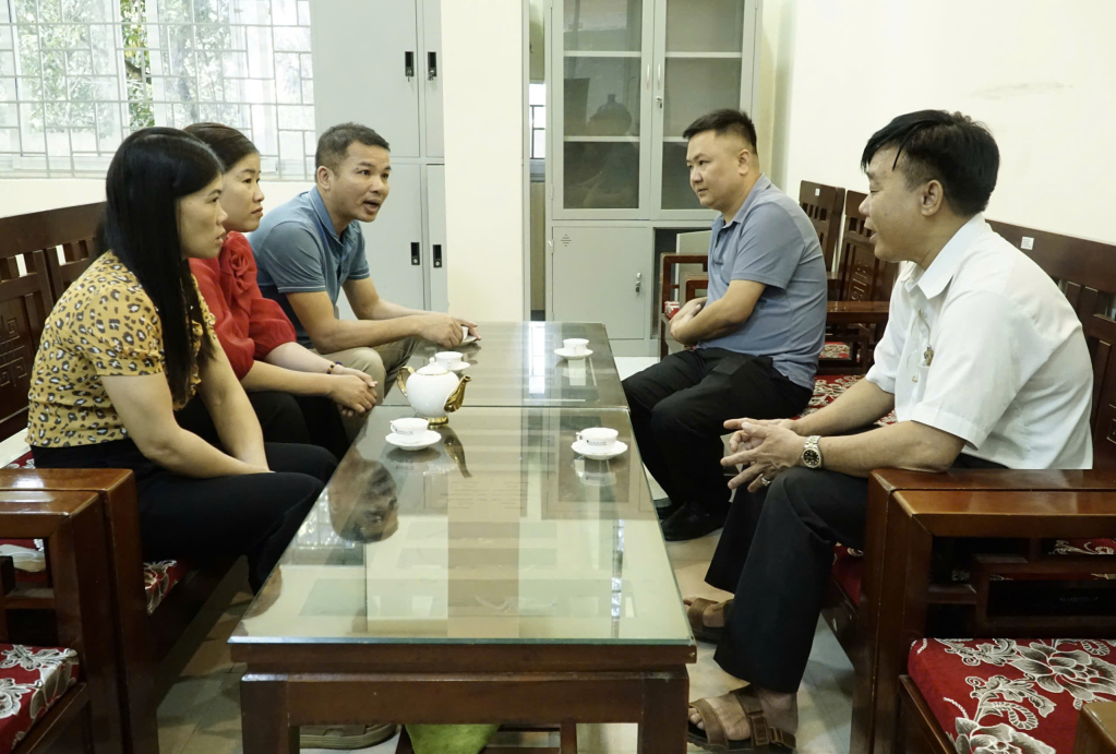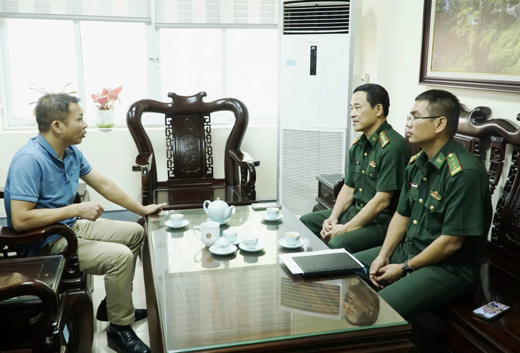 Đại diện Bộ Tư lệnh Biên phòng trao đổi với lãnh đạo xã Trùng Khánh về tình trạng buôn lậu thuốc lá lá.