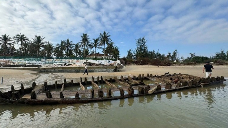Xác con tàu cổ này từng được phát hiện hồi tháng 12/2023 tại khu vực bãi biển Tân Thành, thành phố Hội An (cũ), ban đầu chỉ lộ vài đoạn gỗ trên bãi cát. Chính quyền đã phối hợp cơ quan chuyên môn lấy mẫu xác định niên đại bằng phương pháp đồng vị cacbon. Đến tháng 1/2024, triều cường và cát bồi lấp khiến con tàu bị vùi lấp trở lại.