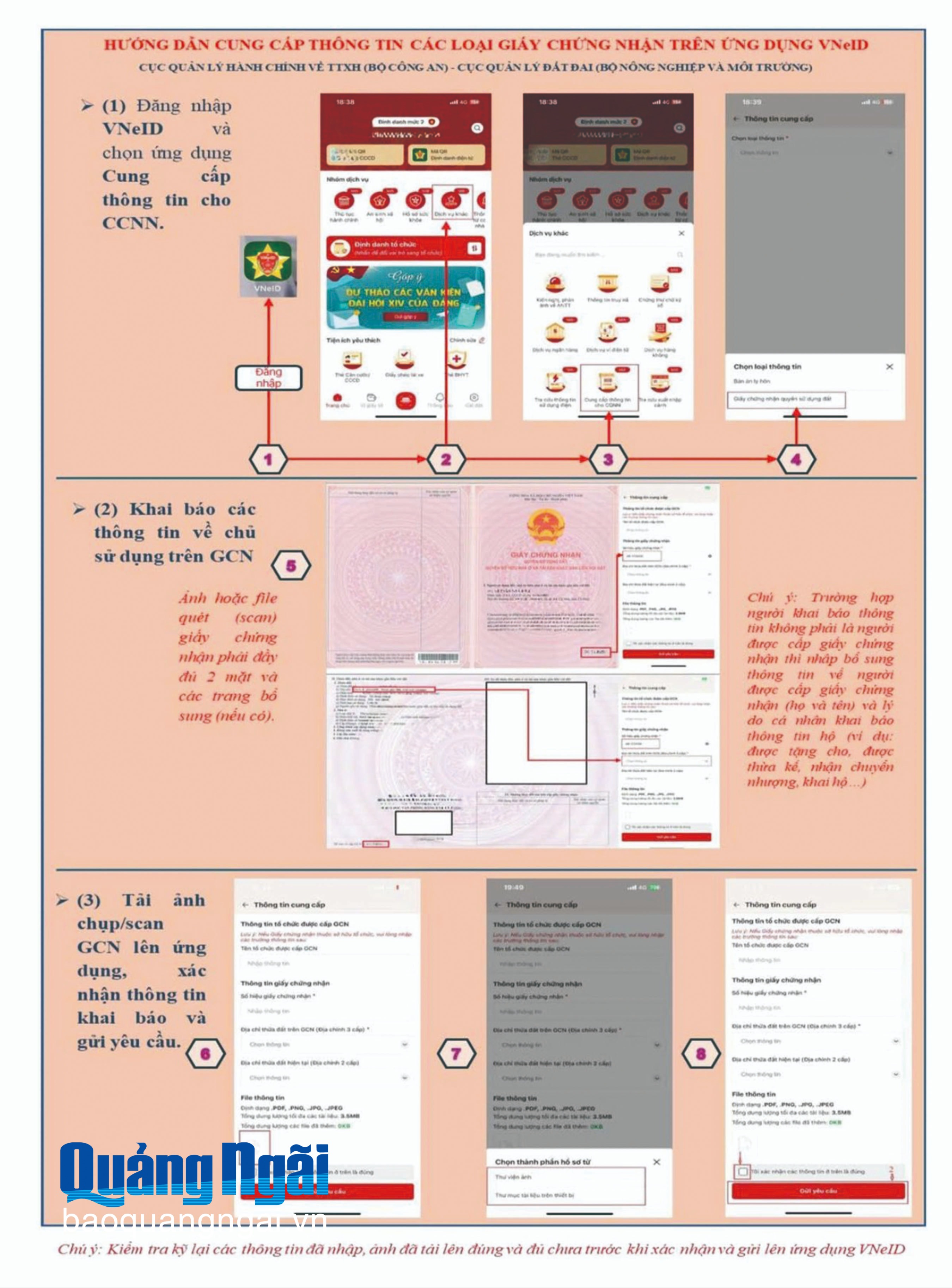 Việc triển khai tiện ích nộp và khai báo thông tin GCNQSDĐ trên VNeID do Cục Quản lý đất đai, Cục Chuyển đổi số (Bộ NN&MT) và Cục Cảnh sát quản lý hành chính về trật tự xã hội (C06 - Bộ Công an) thực hiện. Công cụ này cho phép người sử dụng đất, chủ sở hữu tài sản gắn liền với đất cung cấp thông tin về các loại GCNQSDĐ được quy định tại Khoản 21 Điều 3 Luật Đất đai.