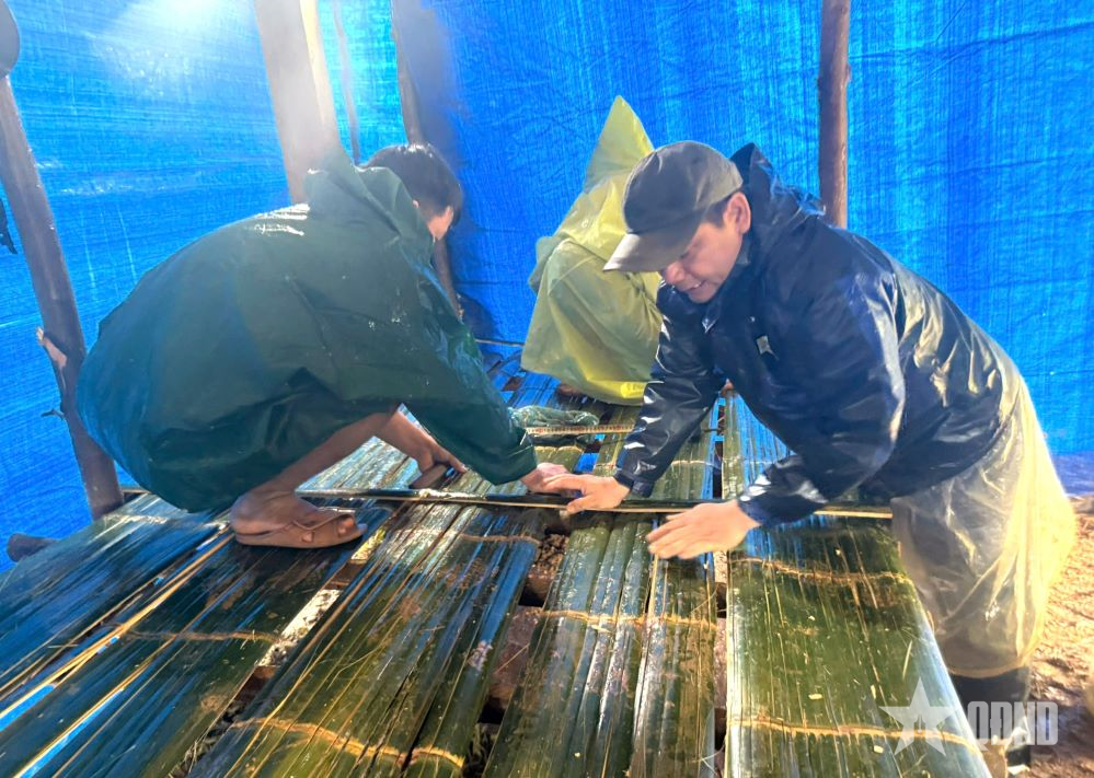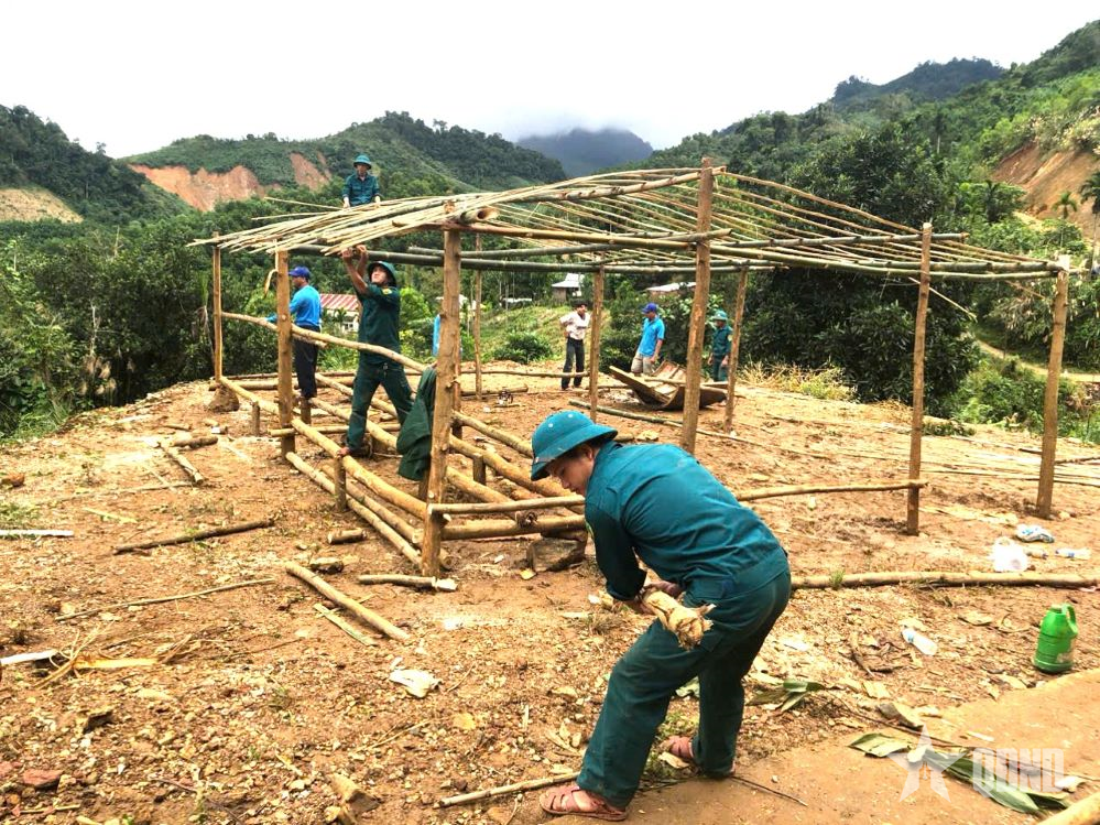 Gần một tuần nay, ngoài việc khắc phục các điểm sạt lở và vượt núi, băng rừng tiếp tế lương thực, thực phẩm cho các khu vực bị cô lập, bộ đội còn tranh thủ thời gian về các thôn để khảo sát, tìm vị trí dựng nhà tranh, nhà tạm cho người dân. Người chặt tre, đóng trụ; người lợp mái, đóng đinh; người gắn phên, dựng liếp, từ thôn 2, 3, 4 (xã Trà Leng) đến thôn Ngọc Giác, Trà Giác, Ngọc Tu, Sông Y (xã Trà Tân)..., bộ đội, dân quân cùng các lực lượng đều làm việc hết sức khẩn trương. Mưa to, gió lớn và đèo dốc quanh co, trơn trượt, sình lầy, phương tiện cơ giới không thể tiếp cận nên các chiến sĩ phải vận chuyển vật liệu, thi công hoàn toàn thủ công. Tranh thủ làm cả ngày và đêm, đến nay, các lực lượng đã hoàn thiện xong 46 căn nhà tranh tre, nứa lá góp phần giúp bà con có cuộc sống ổn định ban đầu.