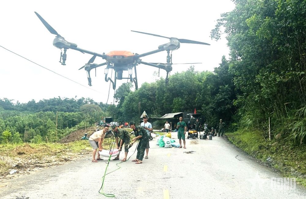 Trưa 3-1, tại ngã 3 bãi đá Bà Phú (thôn Trà Giác, xã Trà Tân), dưới sự điều khiển của anh Trần Văn Duy và Trần Văn Dinh (ở xã Đăk Tô, tỉnh Quảng Ngãi) cùng các cộng sự, 3 thiết bị bay không người lái trọng tải lớn liên tục đưa những bao hàng nặng từ 40kg đến 60kg vượt qua khu vực sạt lở dài gần 800m (gây ách tắc cục bộ Quốc lộ 40B nối xã Trà My với các xã vùng cao phía Tây TP Đà Nẵng) đến địa điểm tập kết.