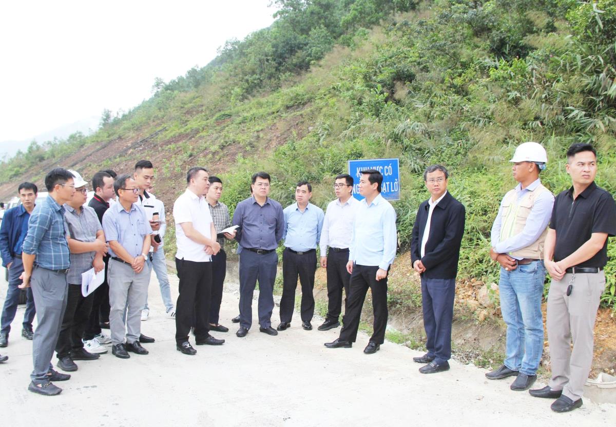 Đại diện Chủ đầu tư báo cáo tiến độ thi công và công tác khắc phục sạt sở tuyến cao tốc La Sơn – Hòa Liên với Thứ trưởng Bộ Xây dựng.