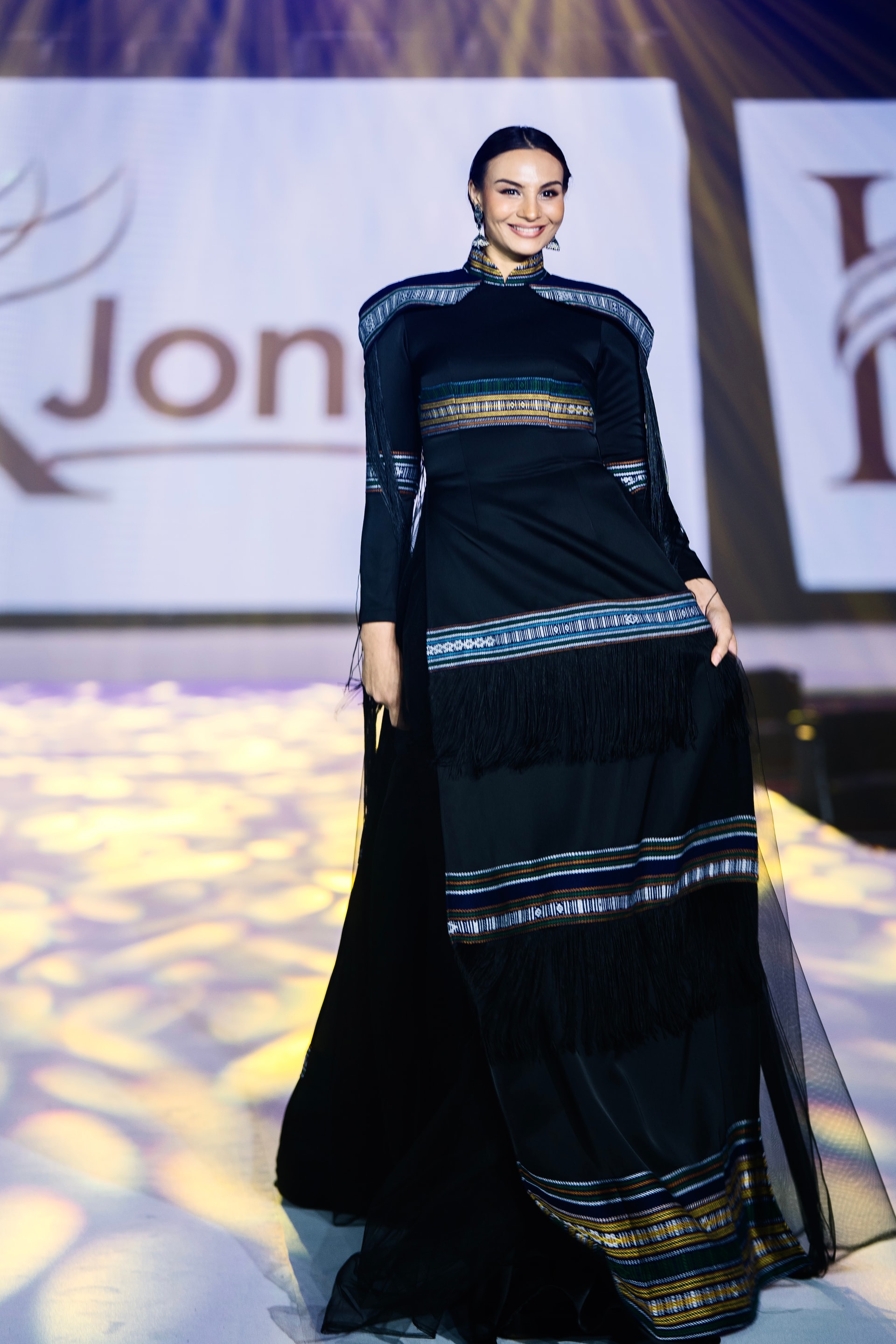 Bộ sưu tập Huyền bí Lang Biang được nhà thiết kế K’Jona lấy ý tưởng từ câu chuyện tình yêu của nàng Ka Lang và chàng K’Biang. Trên nền đen ẩn dụ của vải thổ cẩm, anh kể về xứ sở thần tiên Lang Biang - nơi được Yàng Ndu (đấng sáng tạo) chọn làm klõ trồ (rốn trời) - tâm điểm của vũ trụ. Lang Biang cũng là nơi chứng kiến câu chuyện tình đẹp và buồn giữa nàng Ka Lang và chàng K’Biang. “Ở bộ sưu tập này, tôi chọn màu đen làm màu chủ đạo. Màu đen tự nó đã tạo nên một không gian đầy bí ẩn và cuốn hút, rất phù hợp để kể câu chuyện tình giữa nàng Ka Lang và chàng K’Biang”, nhà thiết kế K’Jona cho biết.