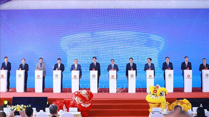 Thủ tướng Phạm Minh Chính và các đại biểu bấm nút khởi công, khánh thành, thông xe kỹ thuật các công trình, dự án. Ảnh: Dương Giang/TTXVN