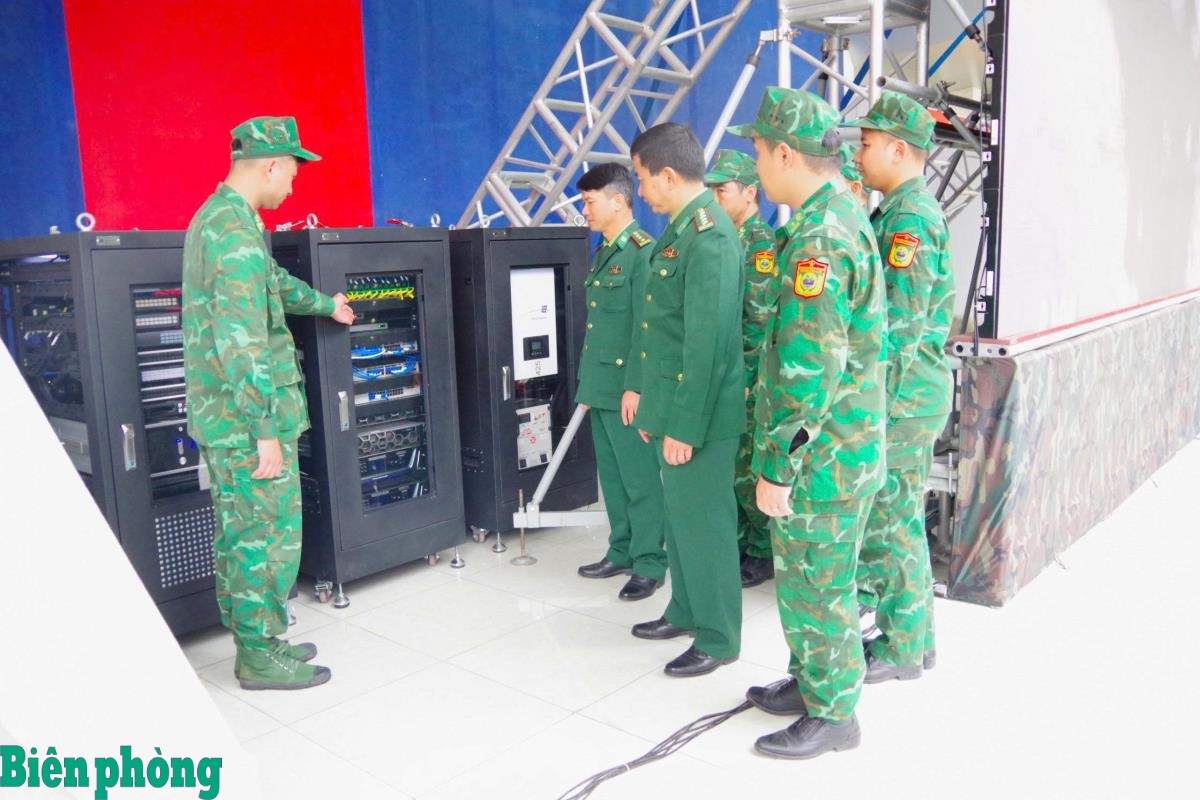 Chỉ huy Lữ đoàn Thông tin 21 Bộ đội Biên phòng kiểm tra công tác huấn luyện quản lý, vận hành, khai thác bộ truyền hình cơ động cấp chiến dịch. Ảnh: Đức Đô