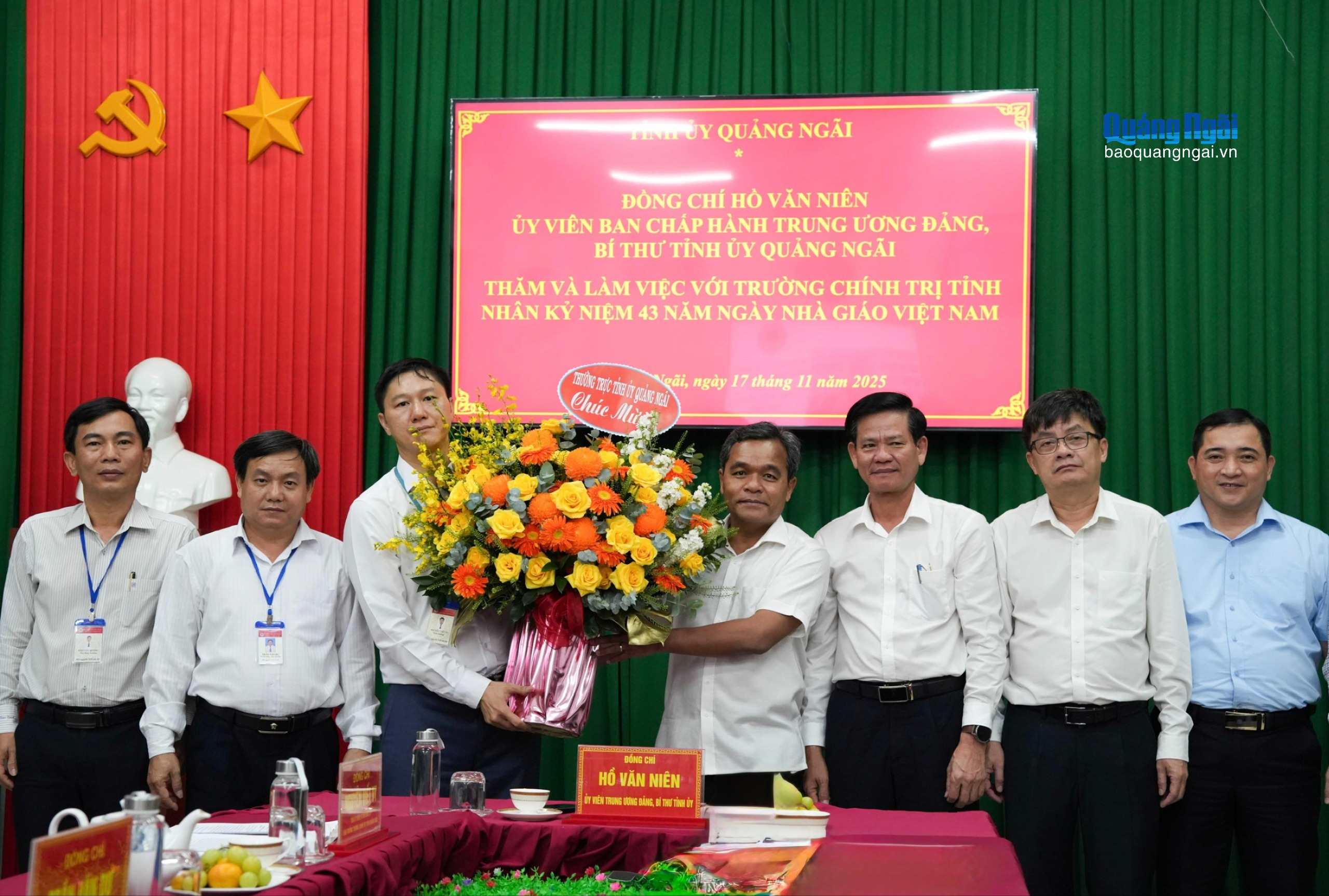 Nhân kỷ niệm 43 năm ngày Nhà giáo Việt Nam (20/11/1982 - 20/11/2025), Ủy viên Trung ương Đảng, Bí thư Tỉnh ủy Hồ Văn Niên tặng hoa, gửi lời chúc mừng đến tập thể lãnh đạo, cán bộ, giảng viên và nhân viên Trường Chính trị tỉnh.