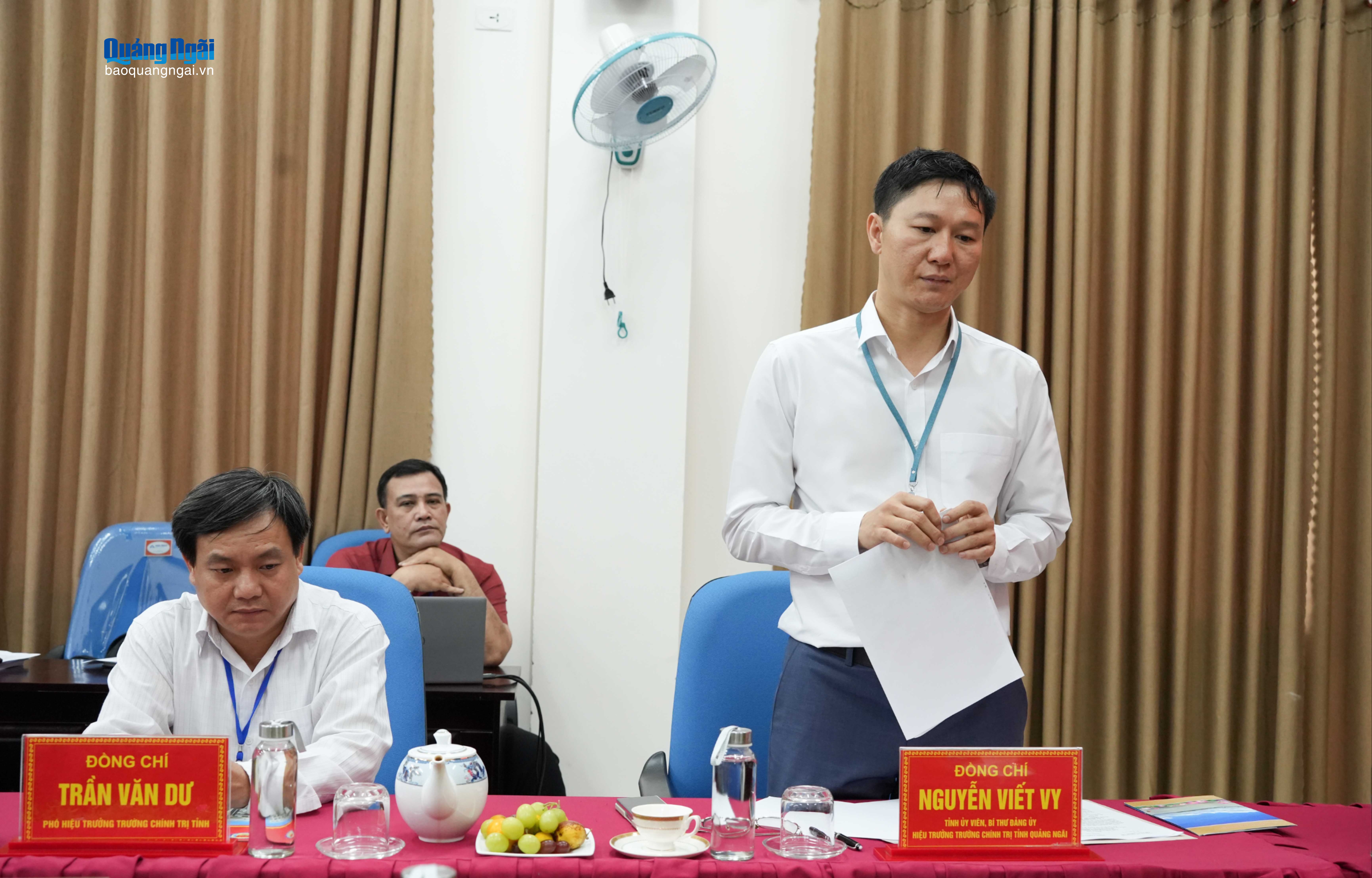Hiệu trưởng Trường Chính trị tỉnh Nguyễn Viết Vy báo cáo tại buổi làm việc.