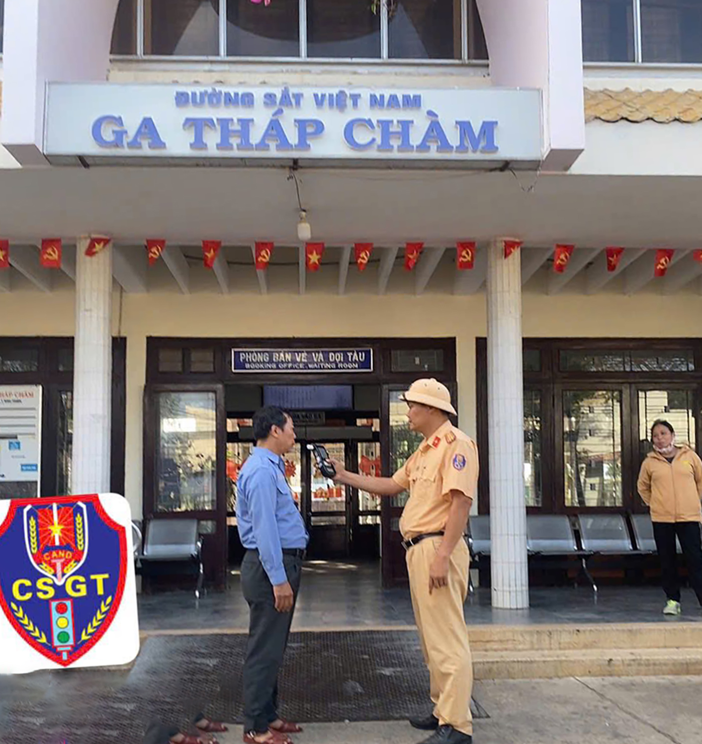 CSGT Công an tỉnh Khánh Hòa kiểm tra công tác đảm bảo an toàn giao thông đường sắt tại ga Tháp Chàm. (Ảnh: CSGT Khánh Hòa cung cấp)
