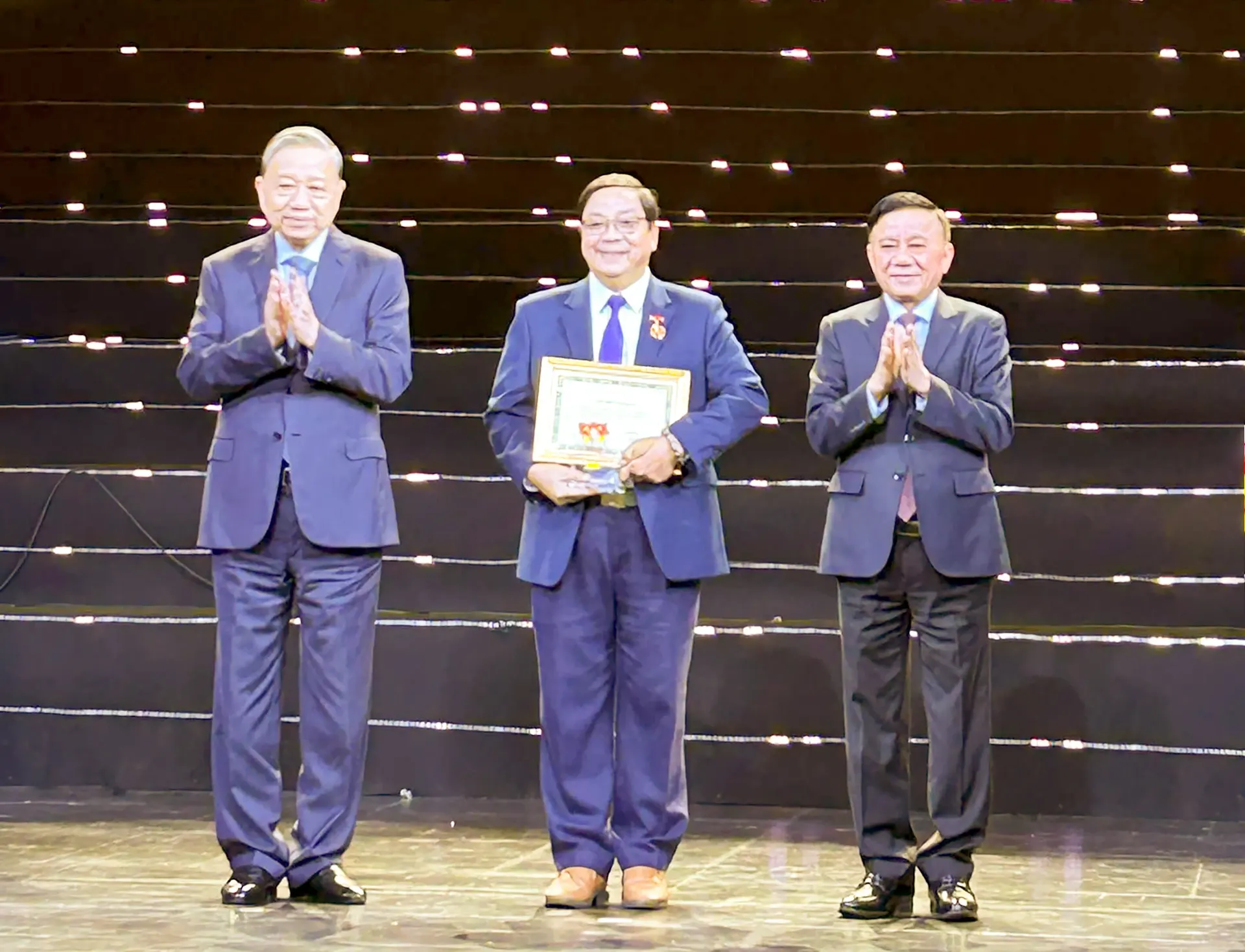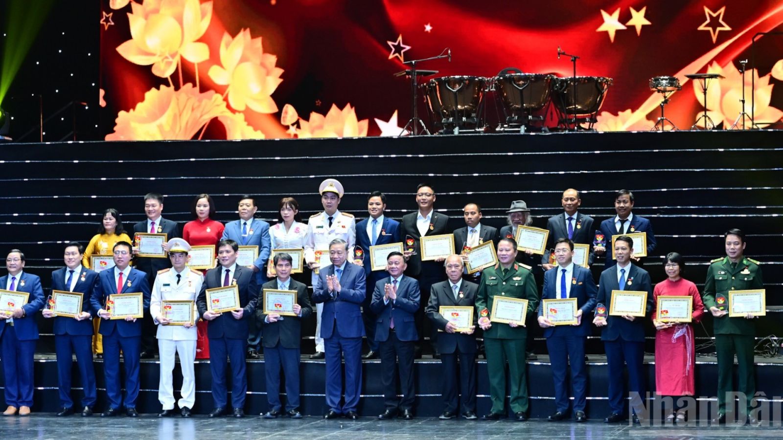 Tổng Bí thư Tô Lâm và Thường trực Ban Bí thư Trần Cẩm Tú trao giấy chứng nhận và biểu trưng cho các tập thể và cá nhân điển hình tiêu biểu. (ảnh: Báo Nhân dân)