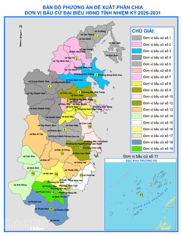 Ủy ban Bầu cử tỉnh cũng ban hành Nghị quyết số 19, ngày 17-12-2025 về việc ấn định và công bố số lượng, danh sách các đơn vị bầu cử, số lượng đại biểu được bầu ở mỗi đơn vị bầu cử đại biểu HĐND tỉnh nhiệm kỳ 2026 - 2031. Theo đó, Khánh Hòa có 19 đơn vị bầu cử, được bầu 67 đại biểu HĐND tỉnh nhiệm kỳ 2026 - 2031. Đơn vị số 1 gồm 5 xã: Đại Lãnh, Tu Bông, Vạn Thắng, Vạn Ninh, Vạn Hưng; được bầu 5 đại biểu. Đơn vị số 2 gồm 4 xã: Bắc Ninh Hòa, Tây Ninh Hòa, Hòa Trí, Tân Định; được bầu 3 đại biểu. Đơn vị số 3 gồm 4 xã, phường: Ninh Hòa, Đông Ninh Hòa, Hòa Thắng, Nam Ninh Hòa; được bầu 5 đại biểu. Đơn vị số 4 gồm 5 xã: Bắc Khánh Vĩnh, Tây Khánh Vĩnh, Nam Khánh Vĩnh, Trung Khánh Vĩnh, Khánh Vĩnh; được bầu 2 đại biểu. Đơn vị số 5 gồm 5 xã: Khánh Sơn, Đông Khánh Sơn, Tây Khánh Sơn, Cam Hiệp, Cam An; được bầu 2 đại biểu. Đơn vị số 6 gồm 3 xã: Diên Khánh, Diên Lạc, Diên Thọ; được bầu 3 đại biểu. Đơn vị số 7 gồm 2 phường: Tây Nha Trang, Nha Trang; được bầu 5 đại biểu. Đơn vị số 8 gồm 3 xã, phường: Nam Nha Trang, Suối Hiệp, Suối Dầu; được bầu 5 đại biểu. Đơn vị số 9 gồm 3 xã, phường: Bắc Nha Trang, Diên Điền, Diên Lâm; được bầu 5 đại biểu. Đơn vị số 10 gồm 2 xã, phường: Cam Lâm, Bắc Cam Ranh; được bầu 3 đại biểu. Đơn vị số 11 có đặc khu Trường Sa, được bầu 2 đại biểu. Đơn vị số 12 gồm 4 xã, phường: Cam Linh, Ba Ngòi, Cam Ranh, Nam Cam Ranh; được bầu 3 đại biểu. Đơn vị số 13 gồm 5 xã: Bác Ái Đông, Bác Ái Tây, Bác Ái, Thuận Bắc, Công Hải; được bầu 3 đại biểu. Đơn vị số 14 gồm 3 xã: Lâm Sơn, Ninh Sơn, Anh Dũng; được bầu 2 đại biểu. Đơn vị số 15 gồm 3 xã: Ninh Hải, Vĩnh Hải, Xuân Hải; được bầu 3 đại biểu. Đơn vị số 16 gồm 3 xã, phường: Mỹ Sơn, Đô Vinh, Bảo An; được bầu 3 đại biểu. Đơn vị số 17 gồm 3 phường: Ninh Chử, Phan Rang, Đông Hải; được bầu 5 đại biểu. Đơn vị số 18 gồm 4 xã: Phước Dinh, Thuận Nam, Cà Ná, Phước Hà; được bầu 3 đại biểu. Đơn vị số 19 gồm 3 xã: Ninh Phước, Phước Hữu, Phước Hậu; được bầu 5 đại biểu.